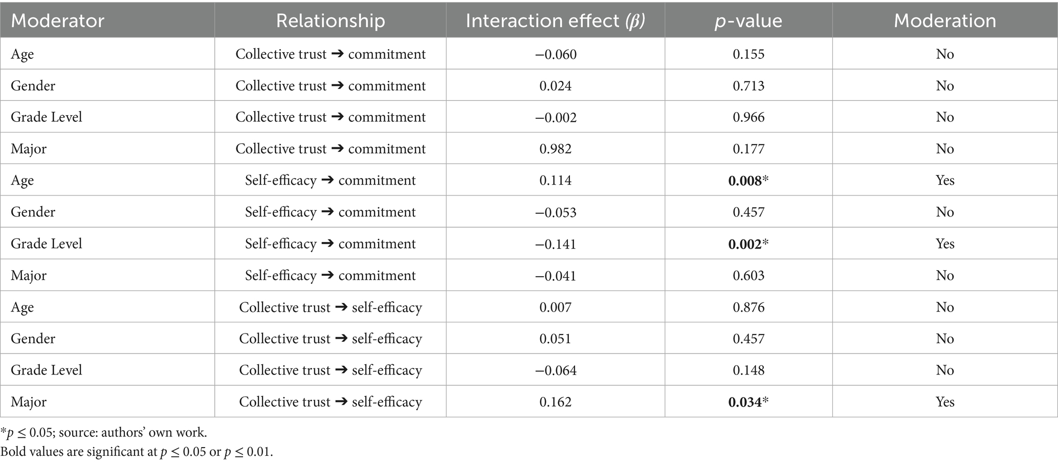 Hypothesis 5 proposed that demographic variables (age, gender, grade level, and major) would moderate the relationships among collective trust, self-efficacy, and affective commitment. Moderation tests using Hayes’ PROCESS procedure indicated three significant interaction effects: age significantly moderated the effect of self-efficacy on affective commitment (β = 0.114, p = 0.008) and grade level significantly moderated the effect of self-efficacy on affective commitment (β = −0.141, p = 0.002). Academic major significantly moderated the effect of collective trust on self-efficacy (β = 0.162, p = 0.034). All other tested interactions were non-significant: collective trust to affective commitment for age group (β = −0.060, p = 0.155), gender (β = 0.024, p = 0.713), grade level (β = −0.002, p = 0.966), and major (β = 0.982, p = 0.177); self-efficacy to affective commitment for gender (β = −0.053, p = 0.457) and academic major (β = −0.041, p = 0.603); and collective trust to self-efficacy for age group (β = 0.007, p = 0.876), gender (β = 0.051, p = 0.457), and grade level (β = −0.064, p = 0.148) (see Table 6). Therefore, these results partially support H5.