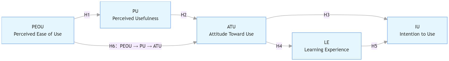 H6: PEOU exerts an indirect effect on ATU through PU (examined via SEM’s indirect effect estimation). This mediation hypothesis aims to clarify a key psychological pathway in the acceptance of MOOCs by vocational learners, contributing to a more nuanced understanding of online learning engagement (Kuo et al., 2021).