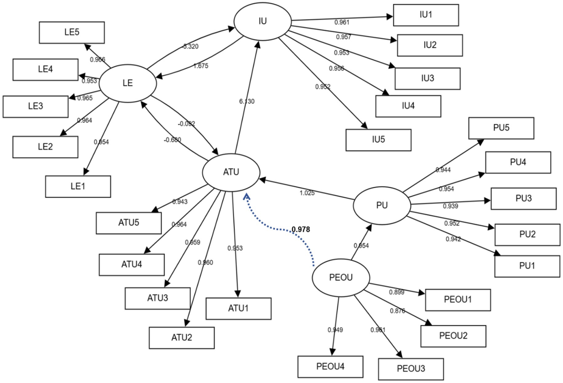 However, several correlations—particularly between ATU, IU, and Learning Experience (LE), ranging from 0.961 to 0.985—exceeded the conventional threshold of 0.85, suggesting potential discriminant validity issues (Fornell and Larcker, 1981; Kline, 2023). This raises concerns regarding the empirical distinctiveness of these constructs and may lead to multicollinearity in subsequent structural model estimation, potentially inflating standard errors and destabilizing parameter estimates (Bagozzi et al., 1991).