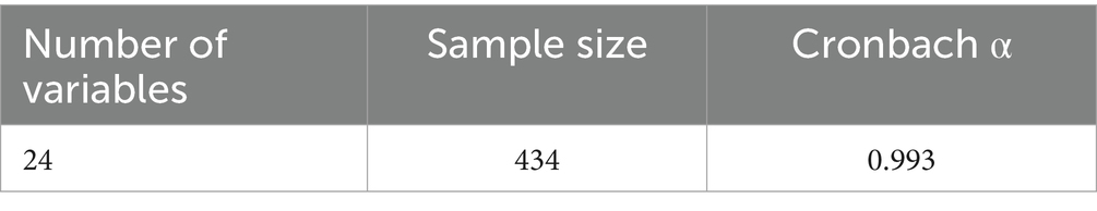 • Reliability: All constructs demonstrated high reliability, exhibiting excellent internal consistency (α = 0.993, Table 1), surpassing the threshold of 0.7 (Nunnally and Bernstein, 1994).