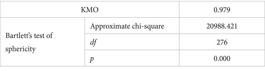 The Kaiser–Meyer–Olkin (KMO) measure and Bartlett’s test of sphericity were conducted to assess data suitability for factor analysis. A KMO value > 0.9 and a significant Bartlett’s test (p < 0.05) were required (Kaiser, 1974). The KMO measure (0.979) and Bartlett’s test (p < 0.001) confirmed sampling adequacy for factor analysis (see Table 2).