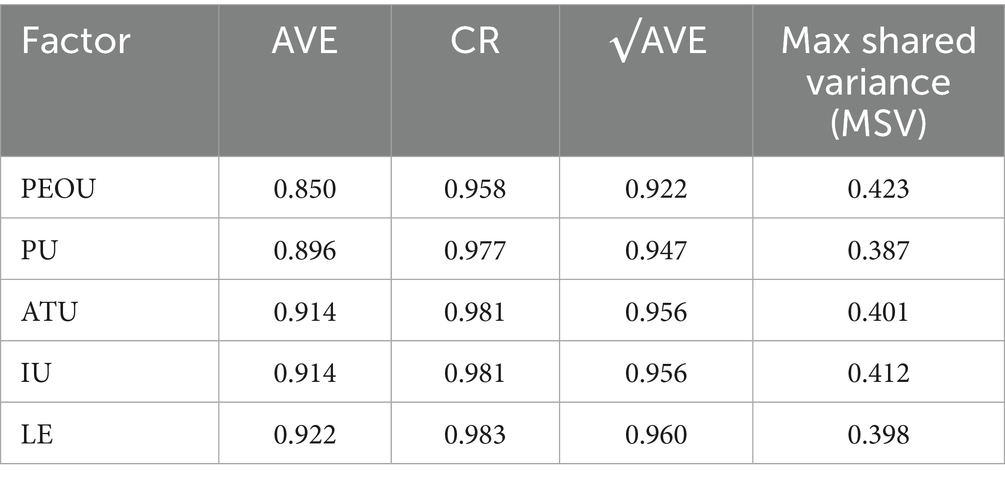 Furthermore, discriminant validity was confirmed, as the maximum shared variance (MSV) for each construct was lower than its corresponding AVE (Fornell and Larcker, 1981), indicating that each latent variable was distinct from the others.