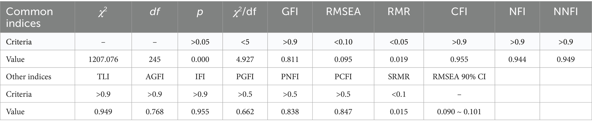 For absolute fit indices, the ratio of χ2/df was 4.927, which is below the threshold of 5 (Kline, 2023). The RMSEA value was 0.095 (90% CI: 0.090–0.101), which falls within the acceptable range (< 0.10) though slightly above the stricter threshold of 0.08 for good fit (MacCallum et al., 1996). The SRMR was 0.015, indicating an excellent fit (Hu and Bentler, 1999). For incremental fit indices, the CFI (0.955), TLI (0.949), and NFI (0.944) all exceeded 0.90, demonstrating good model fit (Bentler, 1990). Additionally, the parsimony-adjusted indices (PGFI = 0.662, PNFI = 0.838) were both above 0.50, suggesting a good balance between model complexity and fit (Kline, 2023).