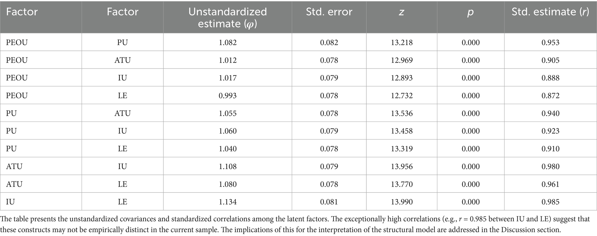 As shown in Table 5, the analysis of factor covariances and correlations revealed systematic and statistically significant associations among all latent constructs (p < 0.001). The standardized correlations ranged from 0.872 to 0.985, indicating large effect sizes per Cohen’s (1988) criteria, while high z-values (all > 12.70) reflected stable parameter estimates (Kline, 2023).