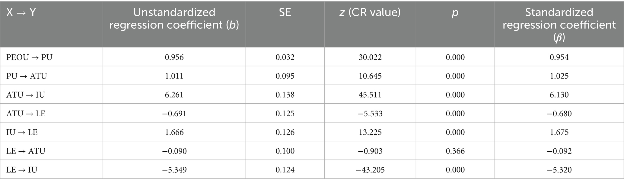 Path coefficients for the hypothesized relationships in the structural model are presented in Table 6. The unstandardized coefficient (b) indicates the change in the dependent variable for a one-unit change in the independent variable. The standard error (SE) measures the precision of this estimate. The z-statistic (or critical ratio, CR) and its corresponding p-value are used for hypothesis testing, with a p-value less than 0.05 indicating statistical significance. The standardized coefficient (β) allows for comparison of the relative effect sizes across different paths.
