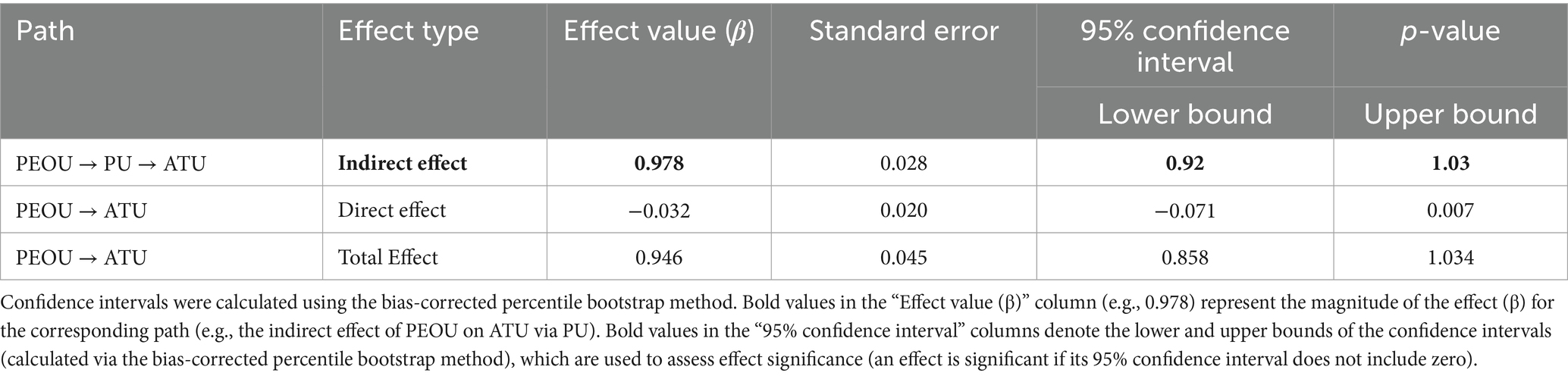 • Structural equation modeling (SEM): Tested hypothesized direct and indirect pathways (e.g., the mediating role of PU in the relationship between PEOU and ATU). SEM was chosen for its ability to simultaneously estimate multiple relationships and quantify indirect effects—aligning with our goal to examine how PEOU influences ATU via PU (H6). H6 was grounded in classic TAM extensions (Venkatesh and Davis, 2000), which first validated PU as a critical mediator between PEOU and ATU, and the unified framework of UTAUT (Venkatesh et al., 2003), which positions PU as a key driver of technology adoption attitudes.