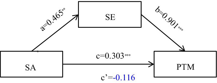Figure 1. Mediation model. c = total effect, C′ = direct effect. Path coefficients are unstandardized (B). *p < 0.05; **p < 0.01; ***p < 0.001.