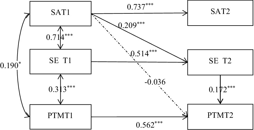 In accordance with the first-order longitudinal data mediation analysis method proposed by Fang et al. (2021), a cross-temporal analysis of the mediating effects among self-acceptance, self-esteem, and prosocial behavior in university students. The bootstrap method was employed with 5,000 bootstrap samples, and significance was tested via a 95% confidence interval. According to the standardized results of the model, the path coefficient from self-acceptance at T1 (Self-Acceptance T1) to self-esteem at T2 (Self-Esteem T2) was 0.209, with a 95% confidence interval of [0.118, 0.301]. The path coefficient from self-acceptance at T1 to prosocial behavior at T2 (prosocial behavior T2) was c’ = −0.036, with a 95% confidence interval of [−0.125, 0.053]. The path coefficient from self-esteem at T2 (Self-Esteem T2) to prosocial behavior at T2 was b = 0.172, with a 95% confidence interval of [0.074, 0.271]. The longitudinal mediating effect (a*b) was 0.036, with a 95% confidence interval of [0.012, 0.068], indicating a significant longitudinal mediating effect. Furthermore, since c’ was not significant, this indicates a full mediation effect.