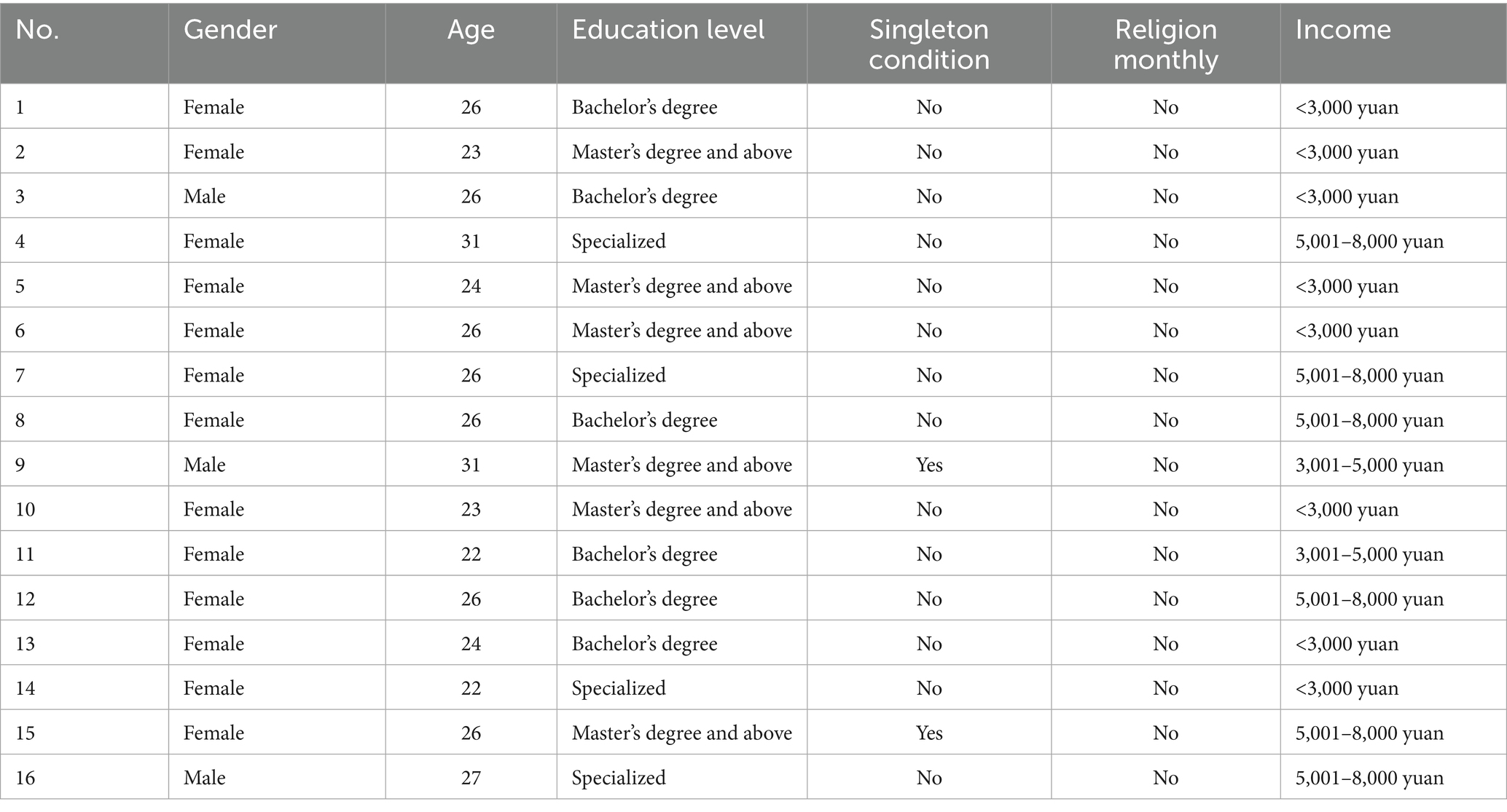 The study employed a purposive sampling method and recruited 16 college students from a medical university in Shanxi Province, China, for semi-structured interviews. The sample size was determined based on the principle of data saturation in qualitative research, whereby recruitment ceased when no new thematic information emerged in subsequent interviews. The final sample consisted of 4 college students (25%), 6 undergraduates (37.5%), and 6 postgraduates (37.5%), with an age range of 22–31 years and a male-to-female ratio of 3:13. The inclusion criteria for participants were as follows: (1) full-time university students; (2) age ≥ 18 years; and (3) voluntary participation with signed informed consent. Exclusion criteria included: (1) a history of diagnosed severe psychological disorders; and (2) previous participation in similar thematic research. Although the sample exhibited diversity in educational background, a notable gender imbalance was present, which may influence the interpretation of prosocial behavior patterns. This limitation will be addressed in the discussion section, and future studies are recommended to adopt more balanced gender sampling strategies. Detailed demographic characteristics of the interviewees are presented in Table 1, which includes comprehensive information on each participant’s identification number, gender, age, educational level, only-child status, religious affiliation, and monthly income.