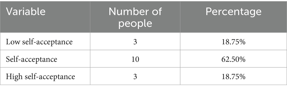 The average self-acceptance score of the interviewees was 19.688 (SD = 4.438), and the overall self-acceptance score was 3.08 (SD = 0.854). A low self-acceptance level was classified according to the standard deviation method (according to the standard deviation method, individuals with scores between 0 and 15 can be classified as having a low self-acceptance level); medium self-acceptance scores may range from approximately 16–23; and high self-acceptance scores may range from 24 to 32, with 3 individuals with high self-acceptance levels, 3 individuals with low self-acceptance levels and 10 people. For specific details, please see Table 2.