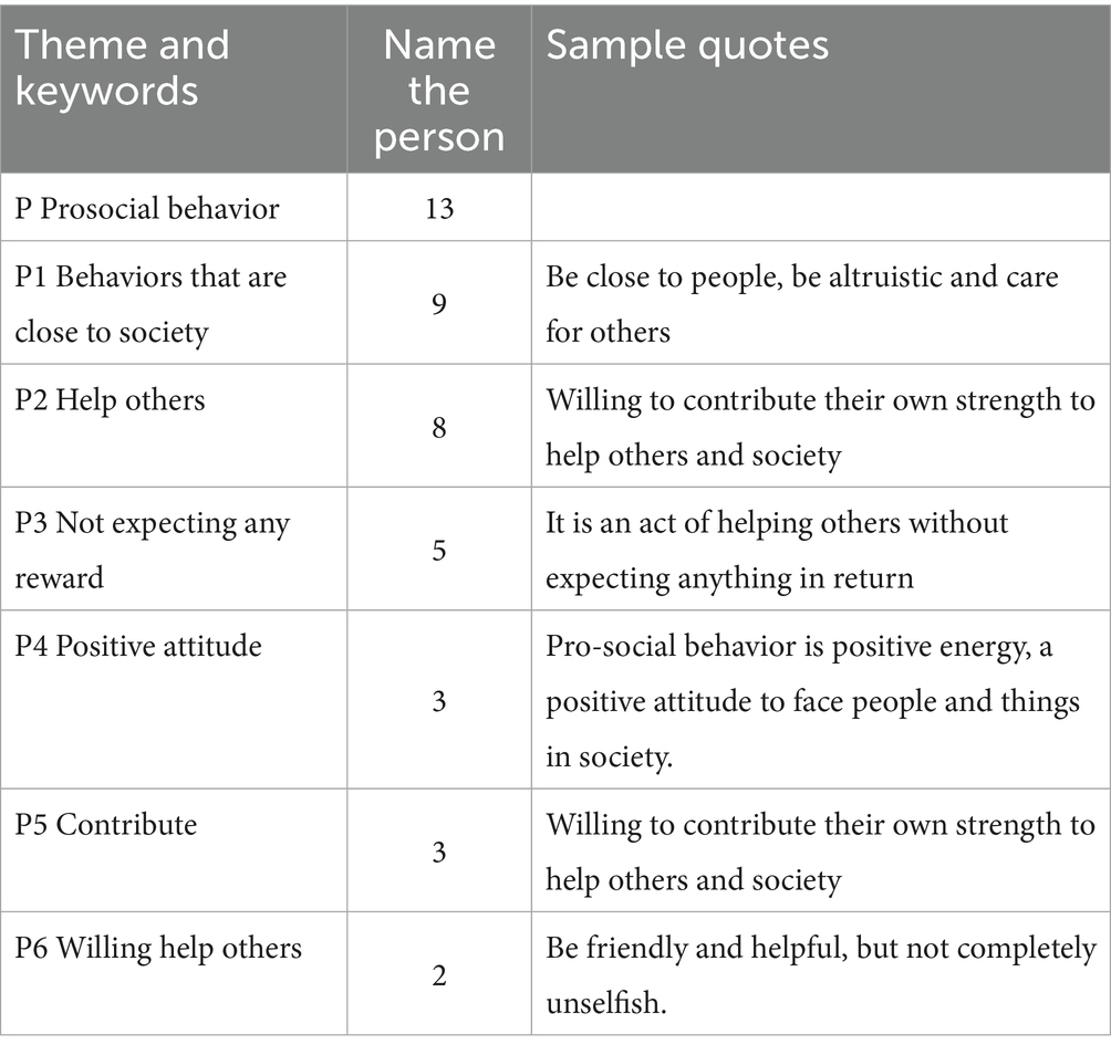 As shown in Table 3, after coding, the prosocial behaviors mentioned by the respondents can be divided into six aspects according to the number of people mentioned, from high to low: “prosocial behaviors,” “helping others,” “no request for return,” “positive attitudes,” “contribution” and “willingness to help.”