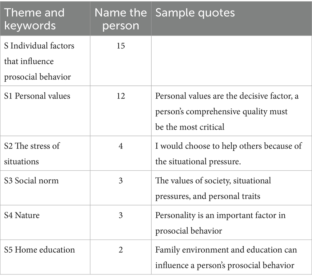 Among the interviewees, 15 indicated that prosocial behavior is related to individual personality and values. Twelve of them stated that it is associated with personal values, suggesting that individuals with higher overall qualities are more likely to help others; four mentioned that it is linked to situational stress, helping others due to pressure from social situations; three noted that it is tied to social norms, as societal values influence prosocial behavior; three noted that it is related to one’s personality, with naturally outgoing individuals having a stronger inclination toward prosocial actions; and two mentioned that it is connected to the family environment and education, noting that if the family environment is harmonious, the motivation for prosocial behavior tends to be stronger. For more details, see Table 4.