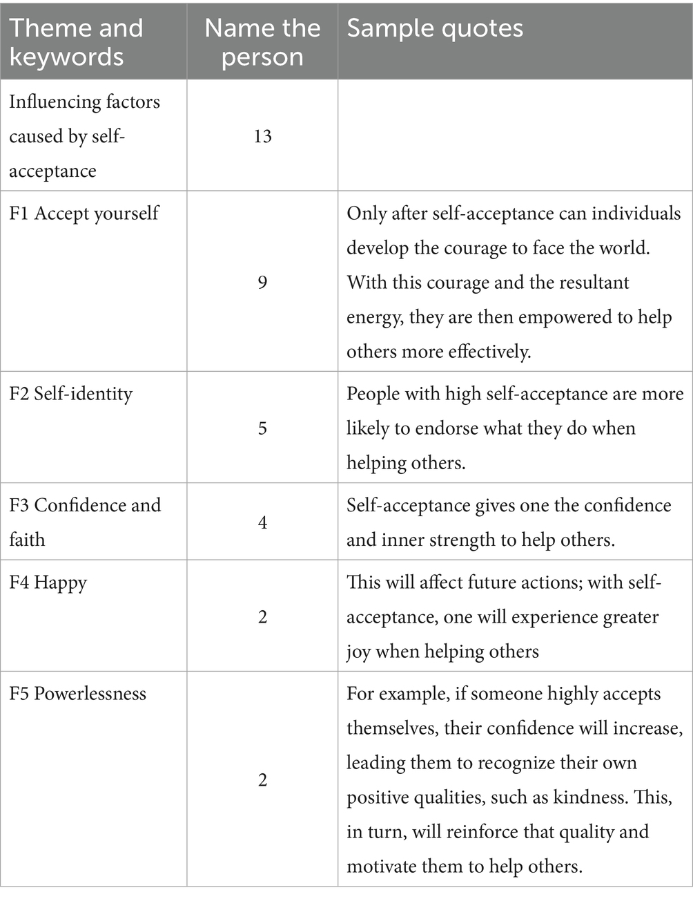 Among the interviewees, 13 individuals indicated that self-acceptance influences prosocial behavior. Table 5 list the various factors and manifestations that the interviewees mentioned as being influenced by self-acceptance in terms of prosocial behavior.