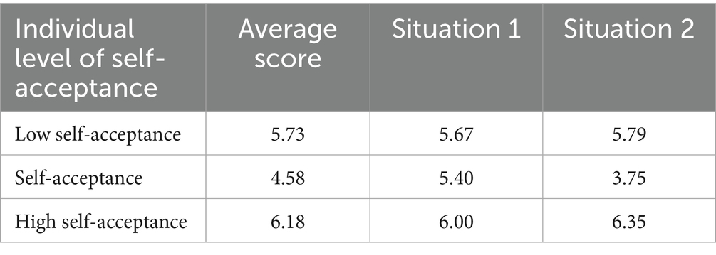 Table 6 display the average scores for the two prosocial behavior scenarios, stratified by three levels of self-acceptance: low, medium, and high. Within each self-acceptance category, the mean score represents the average of the two scenario scores, with higher scores reflecting a greater propensity to engage in the described prosocial behaviors. Like Li et al. (2013), this study employed two scenario-based questions to measure prosocial behavior. The findings revealed that individuals with high self-acceptance demonstrated significantly higher scores in both scenarios than did those with medium or low self-acceptance.