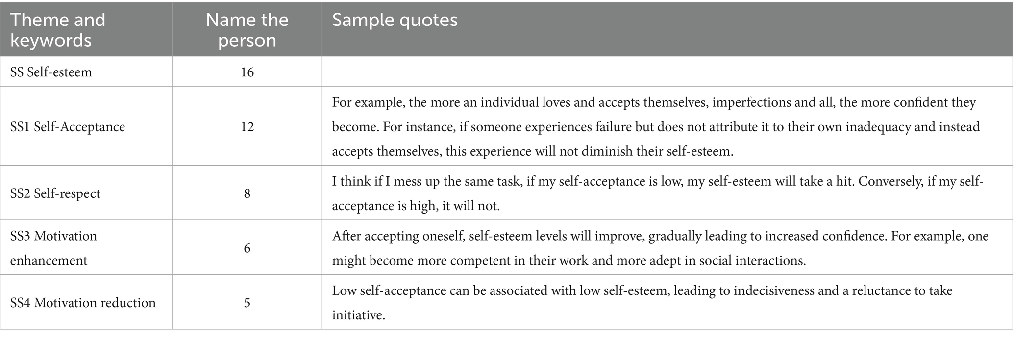 As shown in Table 7, 16 participants mentioned that self-acceptance influenced their self-esteem. Of these, 12 reported that self-acceptance affected their approach to tasks or their self-evaluations after failure; 8 participants specifically mentioned self-esteem, indicating that self-acceptance levels influenced their self-esteem following a setback; 6 participants noted enhanced motivation, indicating that individuals with high self-acceptance became more proactive in their endeavors; and 5 participants described diminished motivation, characterized by hesitation and reluctance to move forward.