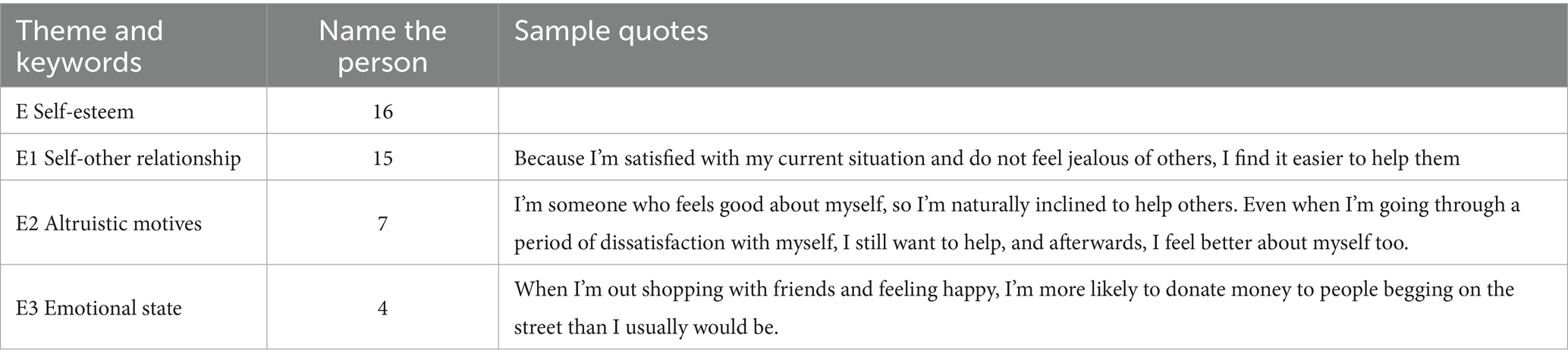 As shown in Table 8, 16 participants mentioned the influence of self-esteem on their prosocial behavior. Of these, 15 reported that self-esteem affected their relationships with others, primarily by fostering satisfaction with their current situation and reducing envy, thereby facilitating helping behavior. Seven participants noted that self-esteem influenced altruistic motivation, mainly by increasing the likelihood of helping others when they feel good about themselves. Four participants mentioned that self-esteem impacted their emotional state, which in turn affected prosocial behavior, primarily by making them more proactive and willing to engage in acts such as donations when in a positive mood (e.g., while shopping with friends).