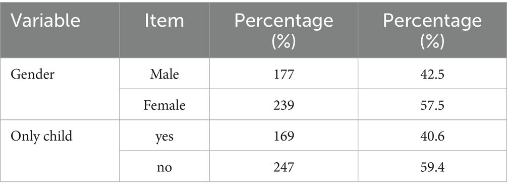 A cluster sampling method was employed to recruit university students from three medical colleges located in Sichuan, Shanxi, and Qinghai Provinces. A total of 432 questionnaires were distributed, with 416 valid responses, yielding a response rate of 96.30%. The sample comprised 177 males and 239 females. Of these, 169 were only children, and 247 were non-only children. The mean age of the participants was 23.77 years (SD = 4.06). The demographic characteristics are detailed in Table 9.