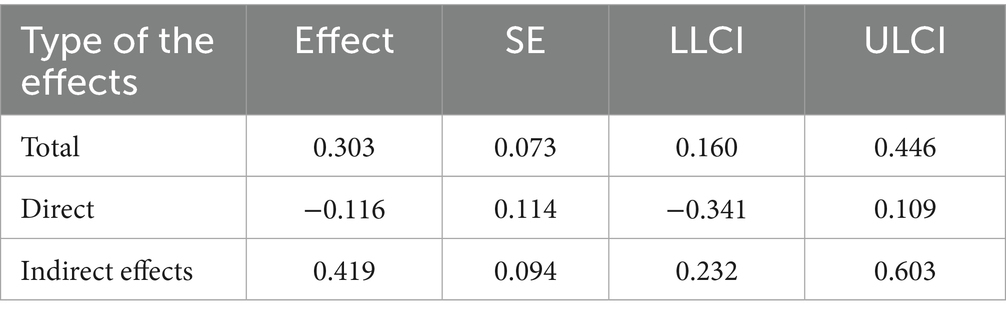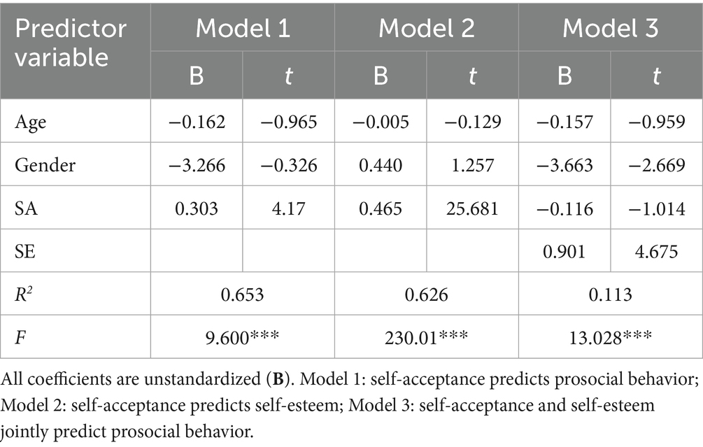 Taking self-acceptance as the independent variable, prosocial behavior as the dependent variable, and self-esteem as the mediator, we employed Model 4 of the PROCESS macro in SPSS, controlling for gender and age. The bias-corrected bootstrap method with 5,000 resamples was used to test the mediation effect, and the results are presented in Table 11. The regression analysis revealed a significant total effect of self-acceptance on prosocial behavior (B = 0.303, p < 0.001).