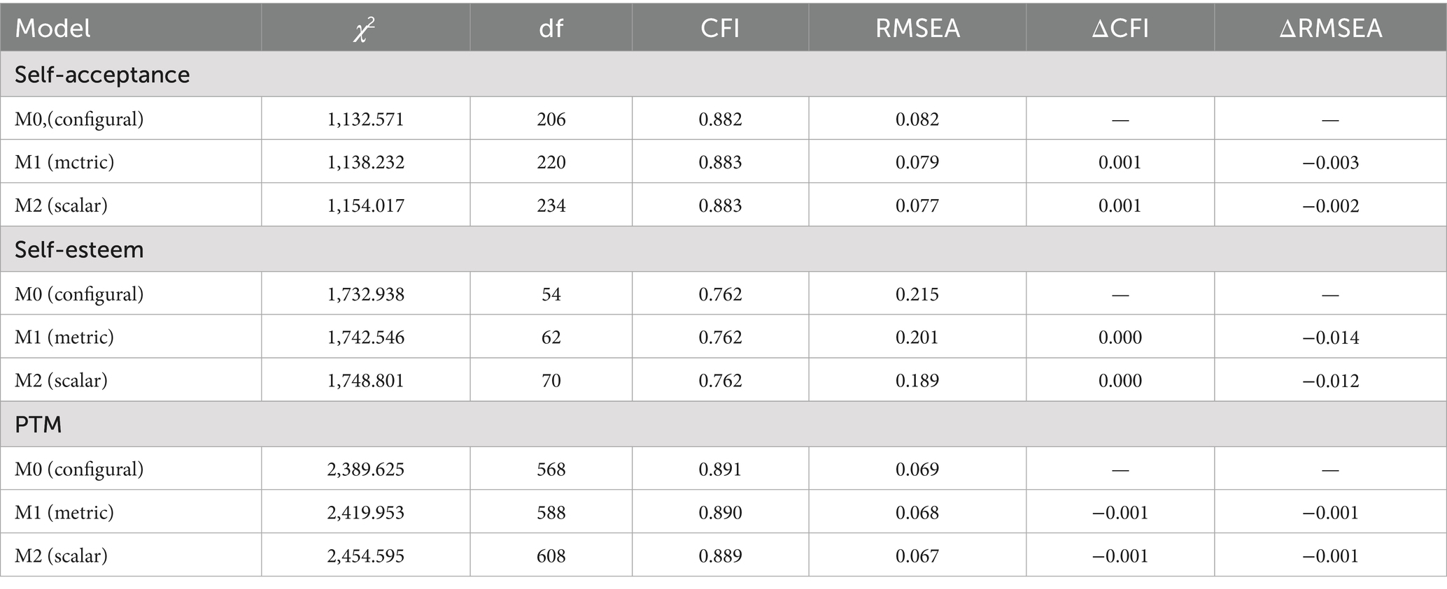 The model fit results for configural, metric, and scalar invariance of the research variables are presented in Table 13. The results indicate that all fit indices for the Self-Acceptance Scale and the Prosocial Behavior Scale met psychometric requirements. Based on the Satorra-Bentler scaled chi-square difference tests and changes in fit indices (ΔCFI, ΔRMSEA), both the Self-Acceptance Scale, Self-Esteem Scale, and Prosocial Behavior Scale demonstrated full scalar invariance, supporting their measurement stability across time points (Hu and Bentler, 1999).