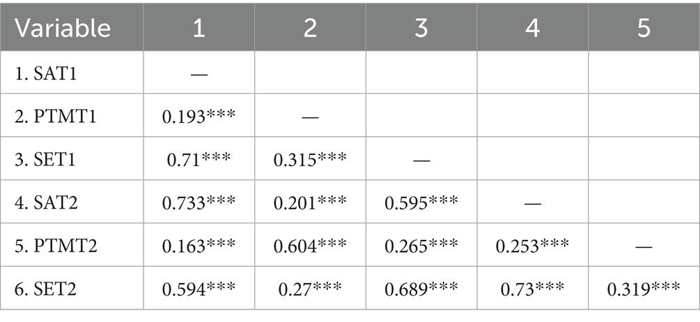 To analyze the interrelationships among the variables, this study controlled for demographic variables such as gender, age, and only child status and examined the scores of self-acceptance, self-esteem, and prosocial behavior measured at two time points (T1 and T2) as dependent variables in a partial correlation analysis. The results, as shown in Table 14, indicate that self-acceptance at T1 was significantly positively correlated with prosocial behavior at T1 (p < 0.001) and self-esteem at T1 (p < 0.001). Furthermore, prosocial behavior at T1 was significantly positively correlated with prosocial behavior at T2 (p < 0.001), self-acceptance at T2 (p < 0.001), and self-esteem at T2 (p < 0.001). Self-esteem at T1 was significantly positively correlated with self-acceptance at T2 (p < 0.001), prosocial behavior at T2 (p < 0.001), and self-esteem at T2 (p < 0.001). Self-acceptance at T2 was significantly positively correlated with prosocial behavior at T2 (p < 0.001) and self-esteem at T2 (p < 0.001), and prosocial behavior at T2 was significantly positively correlated with self-esteem at T2 (p < 0.001). The results of the partial correlation analysis suggest that the data are suitable for further analysis.