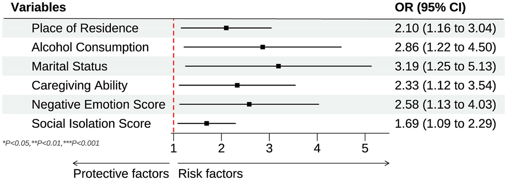 The results of the multivariate logistic regression analysis are presented in Table 2. After adjusting for age, gender, BMI, place of residence, and other demographic and behavioral factors, several variables remained significantly associated with caregiving ability and negative emotions in family members of ostomy patients. In Model I, which adjusted only for age and gender, neither age (OR = 1.02, 95% CI: 0.97–1.08, P = 0.452) nor gender (OR = 1.28, 95% CI: 0.67–2.42, P = 0.468) showed a significant association with caregiving ability and emotional outcomes, suggesting that these demographic factors alone do not substantially predict the outcomes of interest. In Model II, which included additional adjustments for BMI, place of residence, smoking status, alcohol consumption, marital status, monthly income, and caregiving ability, several factors were significantly associated with caregiving ability and emotional outcomes. Specifically, urban residence was associated with a higher likelihood of increased caregiving ability (OR = 1.96, 95% CI: 1.10–3.51, P = 0.022). Alcohol consumption was also significantly associated with increased caregiving ability and emotional resilience (OR = 2.41, 95% CI: 1.08–5.40, P = 0.032). Marital status (married) showed a significant positive association with caregiving ability (OR = 2.77, 95% CI: 1.14–6.70, P = 0.024), and caregiving ability itself was a significant predictor (OR = 1.11, 95% CI: 1.02–1.21, P = 0.017). While in Model III, which included all factors from Model II with additional adjustments for negative emotion and social isolation scores, several factors remained significant. Urban residence continued to be associated with higher caregiving ability (OR = 2.10, 95% CI: 1.16–3.80, P = 0.015). Alcohol consumption (OR = 2.86, 95% CI: 1.22–6.72, P = 0.015) and marital status (OR = 3.19, 95% CI: 1.25–8.13, P = 0.016) were also positively associated with caregiving ability and emotional resilience. Notably, higher caregiving ability remained a significant predictor (OR = 2.33, 95% CI: 1.12–3.54, P = 0.013). Additionally, both negative emotion score (OR = 2.58, 95% CI: 1.13–4.03, P = 0.021) and social isolation score (OR = 1.69, 95% CI: 1.09–2.29, P = 0.005) were significantly associated with outcomes, indicating that lower social isolation and negative emotions were linked to improved caregiving and emotional outcomes among family members. Figure 1 shows the forest plot of significant influencing factors for caregiving ability and negative emotions.