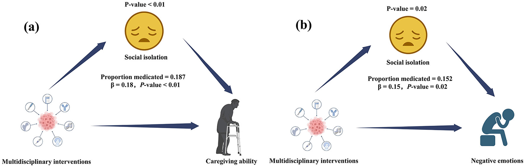 Multidisciplinary accompaniment interventions significantly improved caregiving ability (OR = 2.33, 95% CI: 1.12–3.54), reduced negative emotions (OR = 2.58, 95% CI: 1.13–4.03) and social isolation score (OR = 1.69, 95% CI: 1.09–2.29), with social isolation accounting for 18.7% of the effect on caregiving ability and 15.2% on negative emotions. In addition, significant predictors also included place of residence, marital status, and alcohol consumption.