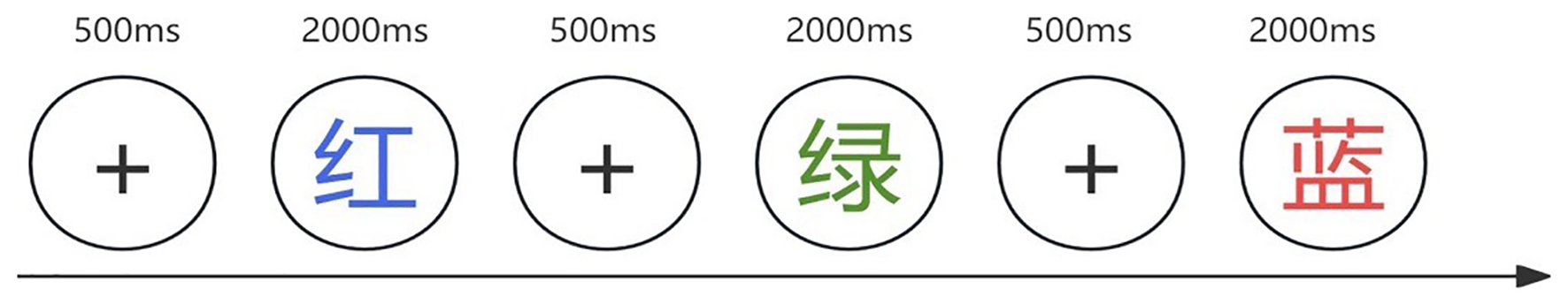 Stroop Task. The words “red,” “green,” “yellow,” and “blue” are presented in either congruent or incongruent colors. Each trial begins with a 500-ms white fixation point, followed by a 2,000-ms color-word stimulus.