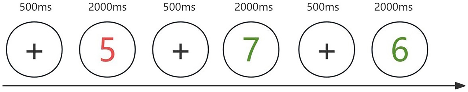 2-back Task. The stimuli are Arabic numerals from 1 to 9. Participants are required to match the current number with the one presented two trials before. Each trial begins with a 500-ms white fixation point, followed by a 2,000-ms numerical stimulus.