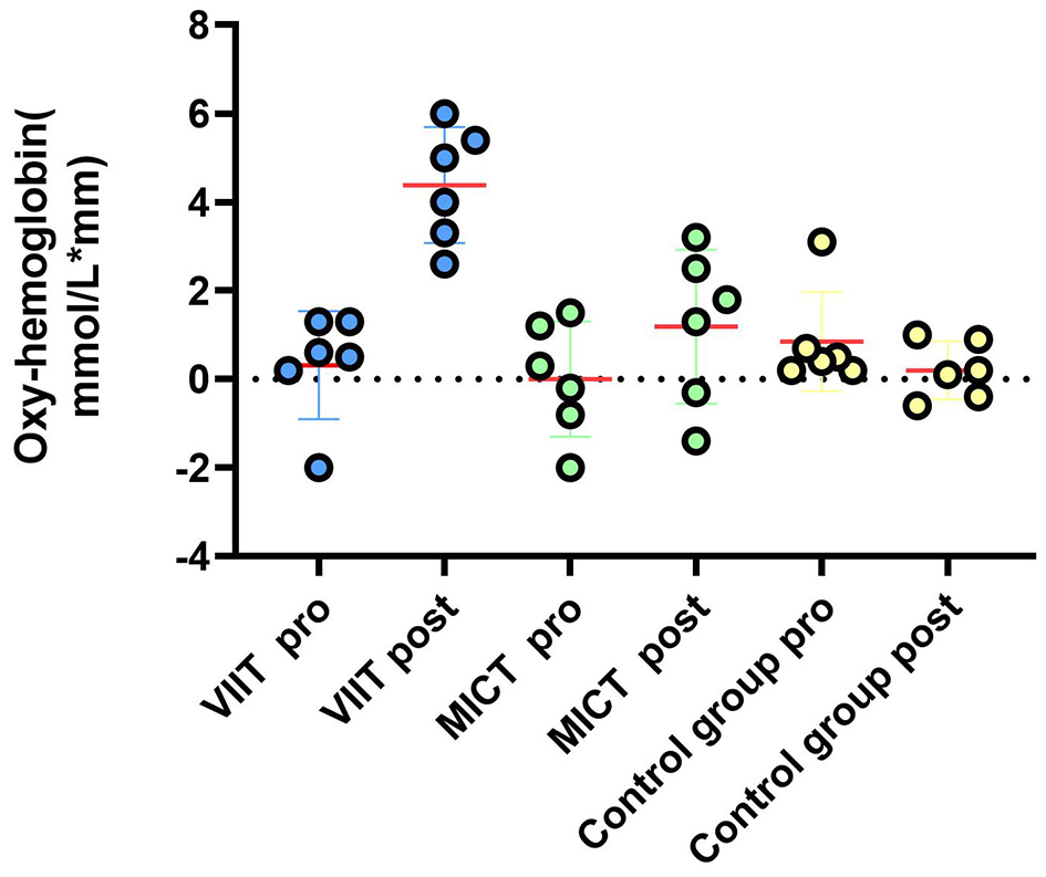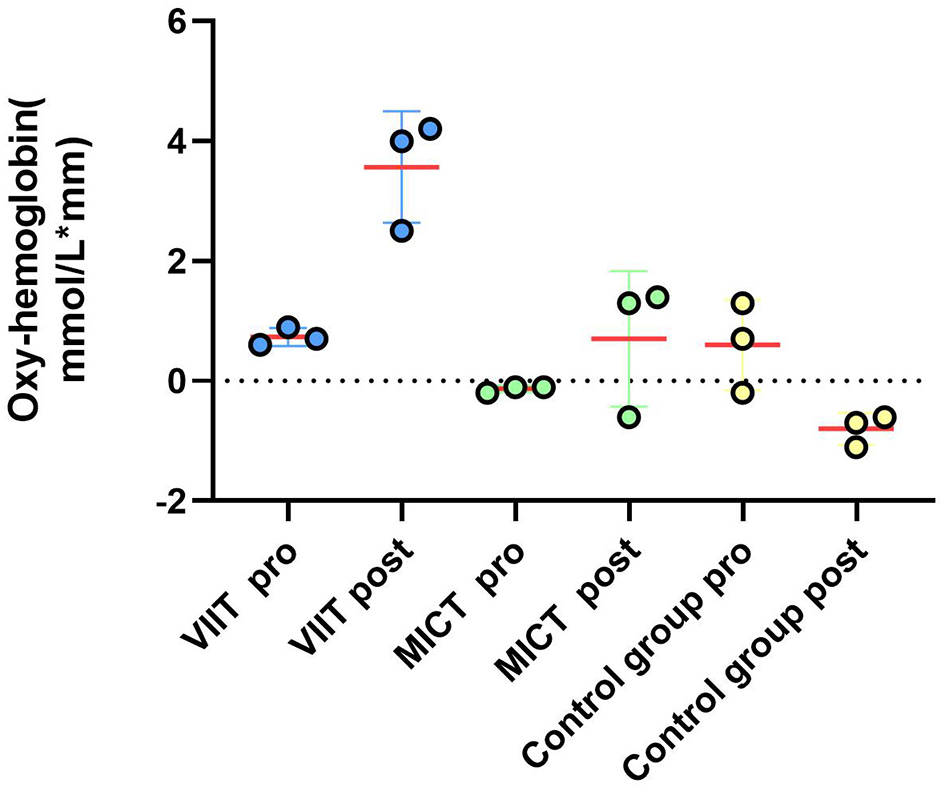 Regarding the relationship between exercise intensity and executive function, evidence from Wang and colleagues suggests an inverted U-shaped relationship, where overly intense exercise may lead to temporary suppression of prefrontal activity (Wang et al., 2013; Coles and Tomporowski, 2008; Zheng et al., 2021; Wu et al., 2019). A meta-analysis by Mcmorris and colleagues further confirmed that moderate-intensity aerobic exercise promotes improvements in working memory (McMorris et al., 2011). These findings collectively suggest that the cognitive benefits of exercise are both intensity-dependent and component specific. VIIT elicits stronger sympathetic activation, greater cerebral blood flow fluctuations, and a more pronounced excess post-exercise oxygen consumption (EPOC) effect through high-intensity intermittent stimuli, potentially leading to more effective increases in prefrontal oxygenation and neuroplasticity. In contrast, MICT promotes the release of BDNF and cerebrovascular adaptation via continuous, stable aerobic metabolic stimulation. This study innovatively employed fNIRS technology and controlled the total energy expenditure across both exercise modes to investigate the differential effects of the two protocols on executive function performance and prefrontal hemodynamics in male college students. In this study, we employed the American College of Sports Medicine (ACSM) classification to quantify aerobic intensity based on percentage of maximum heart rate; moderate intensity and vigorous intensity exercise were classified respectively as 60–69% and 70–79% of the age-predicted maximum heart rate (Audiffren et al., 2009; Hanssen et al., 2018). The age-predicted maximum heart rate was calculated using the standard formula: 220 minus age. Future research should explore the dose-response relationship between exercise intensity and different components of executive function using frameworks such as dual-mode theory and prefrontal cortex activation models.