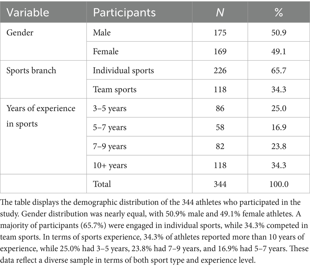 Data were collected from 364 participants for the conduct of the study. However, the data of 20 participants who filled out incorrectly or showed extreme values were removed and the study was completed with the data of 344 participants. Some demographic information of the athletes is presented in Table 1.