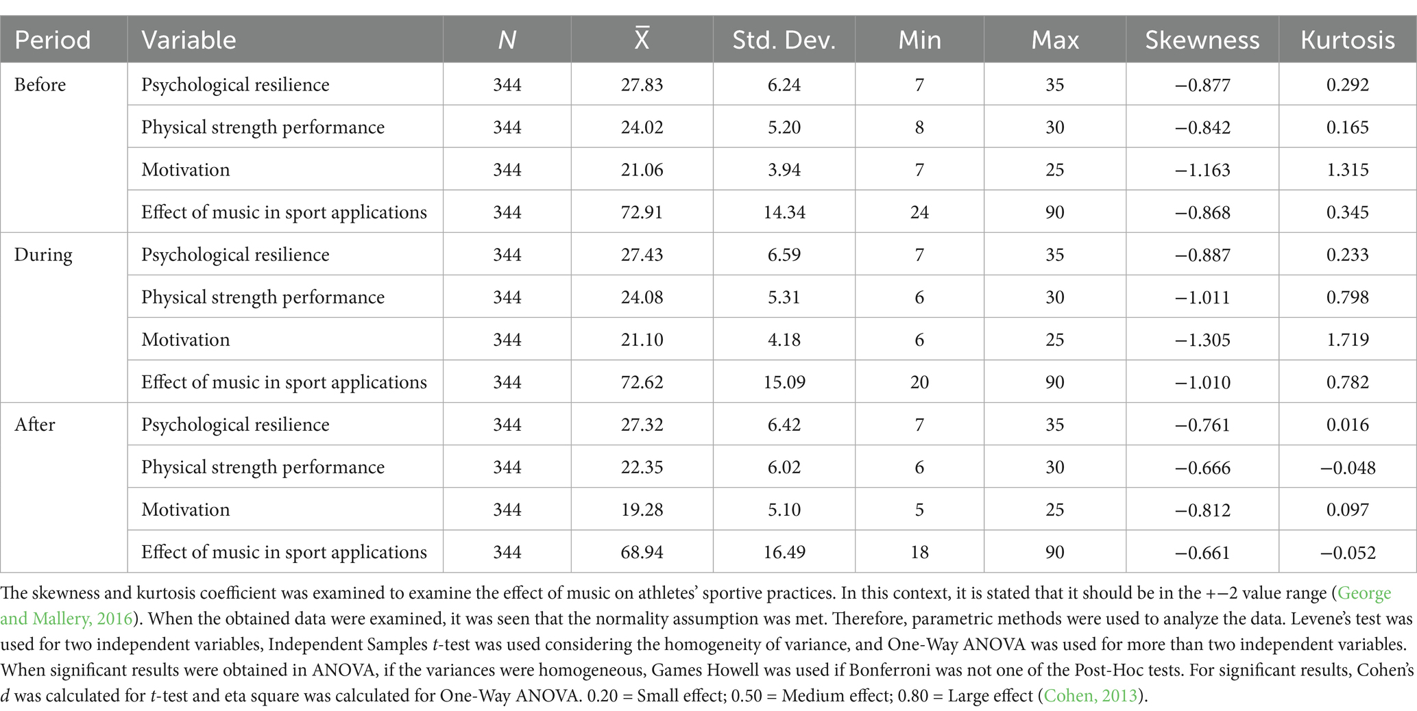 Standardized z scores were calculated during the detection of extreme values from the answers given by the athletes to the scales. In this context, those whose z scores were not within the ±3 value range were removed from the data set. The athletes’ responses to the effect of music in sports activities were examined in the three-part sequence of sports activity: pre-practice, in-practice, and post-practice. Accordingly, the descriptive statistics of the data are given in Table 2.
