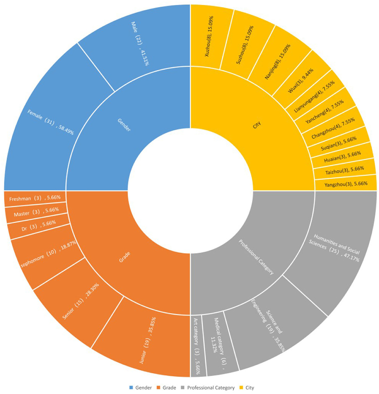 In the second stage, the P-sample (participant sample) was determined. To ensure the representativeness and generalizability of the findings, this study selected Jiangsu Province as the primary research site. Jiangsu is a pivotal hub for higher education in China, hosting nearly 170 universities of various types (e.g., research-intensive, applied technical, and comprehensive). Its institutions attract a highly diverse student population from across the nation, making it a microcosm of the broader Chinese college student demographic. To capture internal diversity, a multi-stage sampling approach was adopted. We selected universities from 11 cities, including Nanjing, Suzhou, Wuxi, Changzhou, Yangzhou, Taizhou, Xuzhou, Huai'an, Yancheng, Suqian, and Lianyungang. This selection ensured coverage across different regions (southern, central, and northern Jiangsu) and university tiers, enhancing the sample's heterogeneity. Potential participants were initially contacted through university networks. Moreover, college students willing to participate in the research were invited to conduct face-to-face or WeChat video interviews. A snowball sampling approach was also employed, whereby initial participants helped refer others, in order to further increase the diversity of the sample (see Figure 1). Adhering to the small-sample research principles of the Q methodology, which posit that a participant group of 40–60 individuals is sufficient for practical study (Smith et al., 1995), data collection continued until a robust sample within this range was achieved. Ultimately, 53 college students participated in this study. While the author's established connections within the province facilitated logistical access, the primary rationale for selecting Jiangsu was its exemplar status in higher education, which supports the extrapolation of the study's conclusions to similar contexts nationwide.