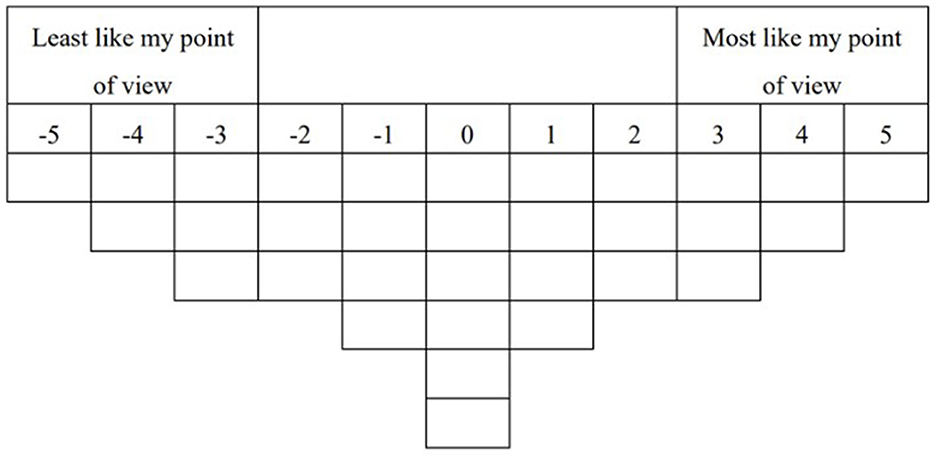 The third stage of the research involved the Q sorting process, which served as the core mechanism for capturing participants' subjective perspectives. Each participant was presented with a set of 32 carefully curated statements (Q-sets) reflecting various attitudes or behaviors related to engaging with hot topics on social media. They were instructed to rank these statements based on their own past experiences or, if lacking direct experience, by imagining plausible scenarios of participation. The sorting was performed according to a predefined quasi-normal distribution grid (see Figure 2), ranging from +5 (most like my point of view) to −5 (least like my point of view). Participants began by reading all statements thoroughly and then initially grouping them into broad categories: those they strongly agreed with, those they strongly disagreed with, and those they felt neutral or uncertain about. They were then required to refine this preliminary arrangement by placing each statement into a specific slot on the sorting board, adhering to the forced distribution pattern. This layout compelled participants to make deliberate comparative judgments, continuously adjusting the order of statements as they reflected on their nuanced opinions. The physical act of moving Q-set cards or digitally arranging items, combined with audible “think-aloud” commentary, provided rich qualitative insight into their decision-making process. Throughout the approximately 30-min session, participants were encouraged to verbalize their reasoning—why certain statements were placed at the extremes and others near the middle. This talking time notionalized the sort and added depth to the quantitative data. The entire process thus yielded a detailed personal configuration of viewpoints, where each of the 32 statements received a unique score between +5 and −5, effectively mapping the participant's subjective landscape onto an empirically analyzable structure.