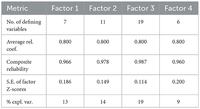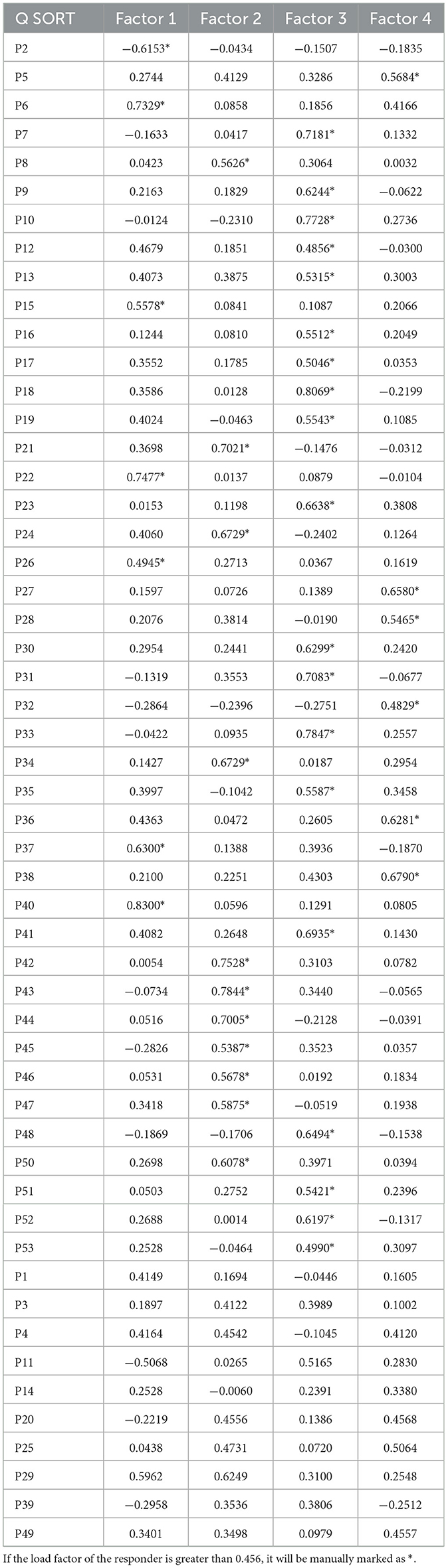 Then, the explanatory ratio of each factor to the total variable and the respondents' loading by factor can be obtained. According to the standard of the Q method, if the respondents' loading by factor is greater than 2.5 (32), then this respondent is included in the factor. Otherwise, it is not included in the factor (Watts and Stenner, 2012). Therefore, the respondents' loading by factor in this study can only be attributed to this factor if they are more significant than 0.456. A single factor with both positive and negative significant loadings is termed ‘bipolar'. Crucially, these negative loadings must be retained as they represent a diametrically opposed viewpoint. The statistical significance is determined by the absolute value of the loading, but the sign reveals the direction of agreement. Thus, a single bipolar factor requires two distinct interpretations: one for the configuration defined by the positive loadings, and another for its mirror-image defined by the negative loadings (Watts and Stenner, 2012). If the respondent can be classified into two or more factors simultaneously, the respondent needs to be deleted. Finally, the factor is retained when the effective respondents within the factor are ≥2 (Watts and Stenner, 2012). After deleting respondents who were not loaded or invalid (marked with shadows in the figure), all four factors were ultimately retained and cumulatively explained 81% of the total variance (exceeding the standard of 34%−40%), which was considered sufficient (Watts and Stenner, 2012).