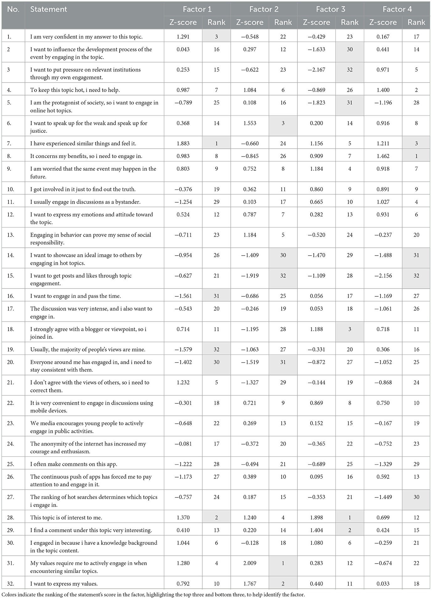 From the results of factor analysis, there are four patterns or tendencies in college students' motivation to engage in online hot topics. Since researchers typically name factors based on discriminative statements and label each factor differently (Simons Joan, 2013), these four factors are ultimately named: self-referential rationalists, values-driven advocates, interest-oriented participants, and rights-protection oriented participants (see Table 1). Table 2 provides detailed statistical information about the four factors. Table 3 shows the Z-score and sorting of 32 statements on four factors. The interpretation is mainly based on the content of extreme values, while others serve as auxiliary explanations.
