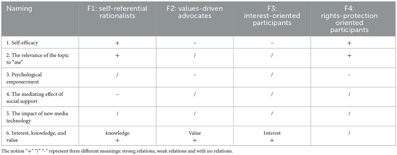 Table 4 shows the relationship between the results of four factors in the results and the six-dimensional motivation extracted in the literature review. Factor 1 strongly correlates with self-efficacy, the correlation of the topic to “me”, and knowledge. Factor 2 highly emphasizes values—and factor 3 favors interest. Factor 4 is similar to factor 1 in emphasizing common aspects: self-efficacy and the topic's relevance to “me”, but factor 1 emphasizes the “self” more while factor 4 focuses more on benefit. This reflects that the internal combination of specific engagement motivations is specific, differentiated, and distinctive. Therefore, it triggers thinking about the internal generation logic of these four different engagement motivations.