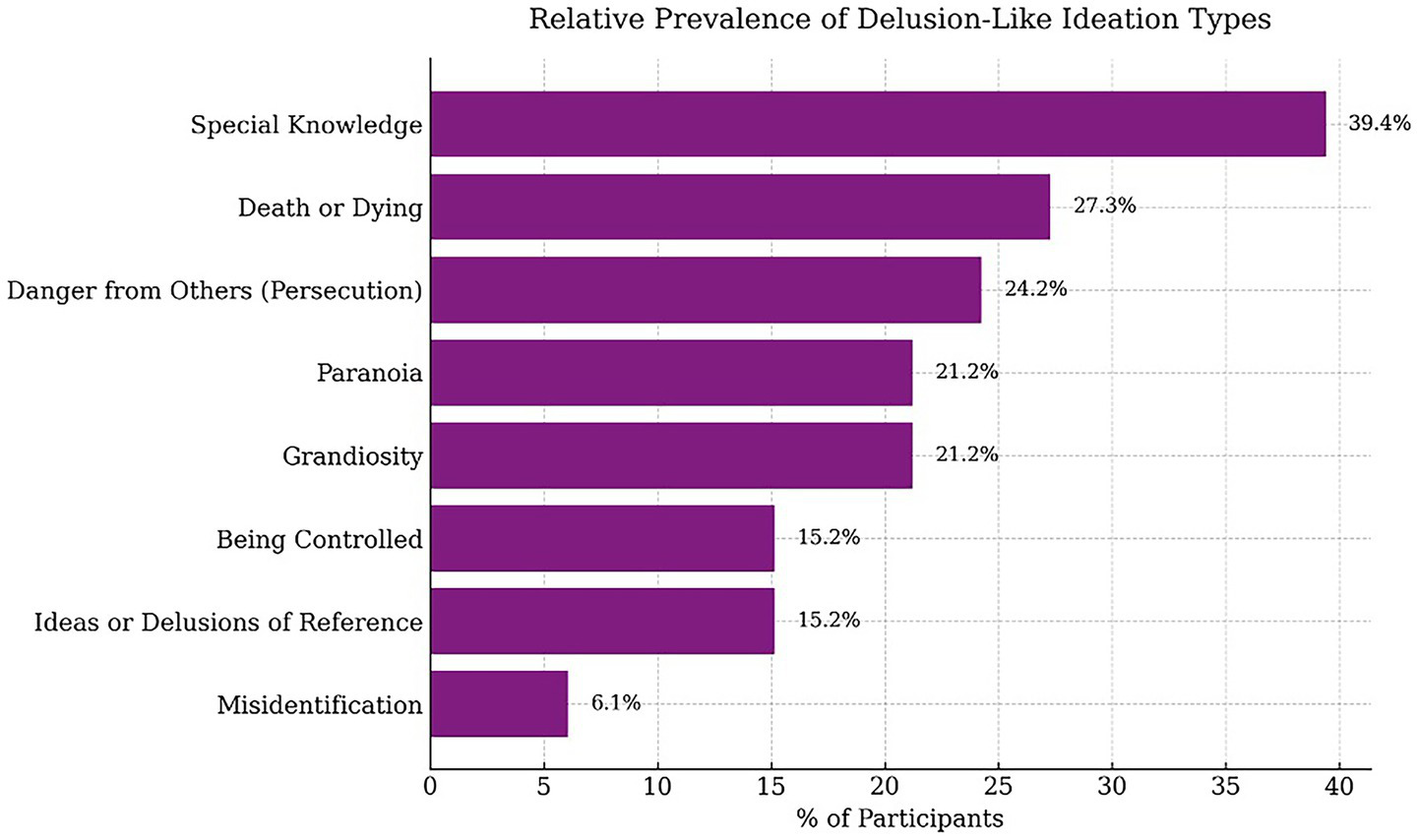 While delusions are a hallmark of schizophrenia spectrum disorders as well as acute psychotic episodes, including transient ones, a growing body of research suggests that delusional ideation is highly prevalent in non-clinical populations, with estimates varying between 10 and 30% (Freeman, 2006). Recent theories suggest that different kinds of delusional ideation are located on a continuum between mild and severe (Betts et al., 2018) and represent multifactorial (Yung and Lin, 2016) and dynamic rather than all-or-nothing or static phenomena. It has also been suggested that delusional ideation represents a measure of psychosis-proneness, i.e., a potential predisposing trait to psychosis, in particular when a high degree of delusional thought is accompanied by hallucinatory phenomena and other psychotic-like experiences (Kelleher et al., 2011; Smeets et al., 2013). At the same time, transient delusional ideation in the general population, especially when referring to experiences typically understood as paranormal or irrational, has also been suggested to express “healthy schizotypy” (McCreery and Claridge, 2002). Some delusional experiences may even represent adaptive ways of coping with existential challenges by providing an alternative meaning-making container to help regain a sense of agency over one’s own life (Bortolotti, 2023).
