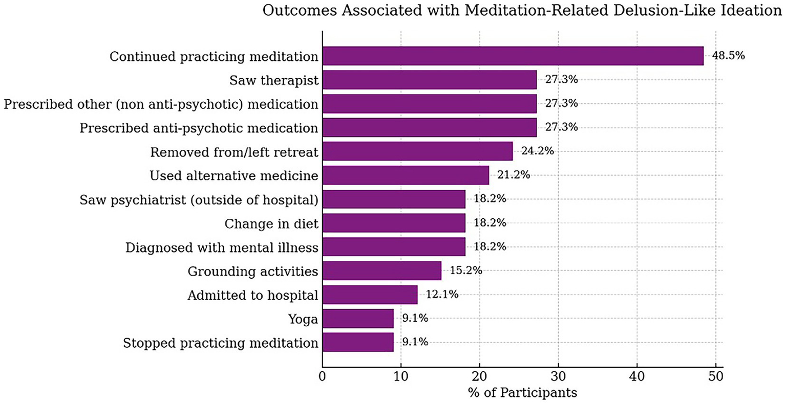 In addition, we coded for 13 kinds of impacts and treatment responses that followed meditation-related DLIs including whether participants: (1) received a formal diagnosis of a mental health disorder; (2) were admitted to a hospital; (3) were removed from or left the retreat; (4) were prescribed an anti-psychotic medication; 5() were prescribed another psychotropic medication; (6) continued meditation after the incident; (7) stopped meditating after the incident; (8) used alternative medicine as an intervention (e.g., homeopathy, acupuncture, herbal, massage therapy, etc.); (9) used grounding activities; (10) used yoga; (11) changed their diet; (12) saw a therapist; and (13) saw a psychiatrist outside of a hospital context. All outcomes were coded as binary yes/no variables. The classification of an item into impacts and responses was based on participants’ explicit mention in interview that those outcomes were directly related to their challenging DLI experience. The interview excerpts were coded by two coders (ES and CL), and consensus was established through a discussion.