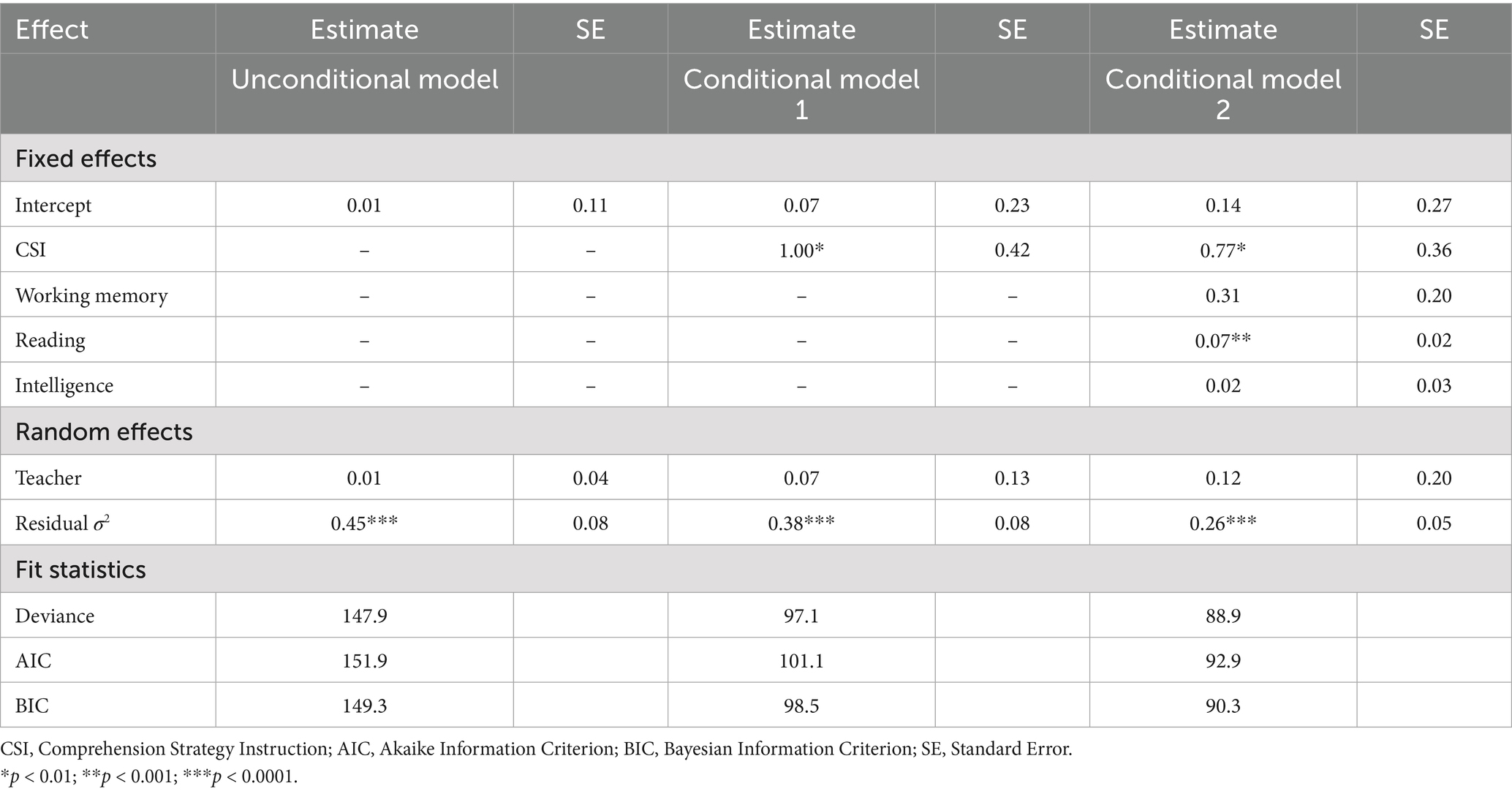 The third model incorporated WM, reading ability, and intelligence as covariates. The CSI mean effect remained significant (0.77). Reading comprehension was a significant predictor (0.07); while working memory (0.31) and intelligence (0.02) were not significant predictors. The model reduced the significant random effects of intercepts between classrooms compared to the unconditional model and accounted for 31% of the explainable variance. Conditional model 2 yielded a lower deviance (88.9), AIC (92.9), and BIC (90.3) compared to the unconditional model, indicating a better fit.