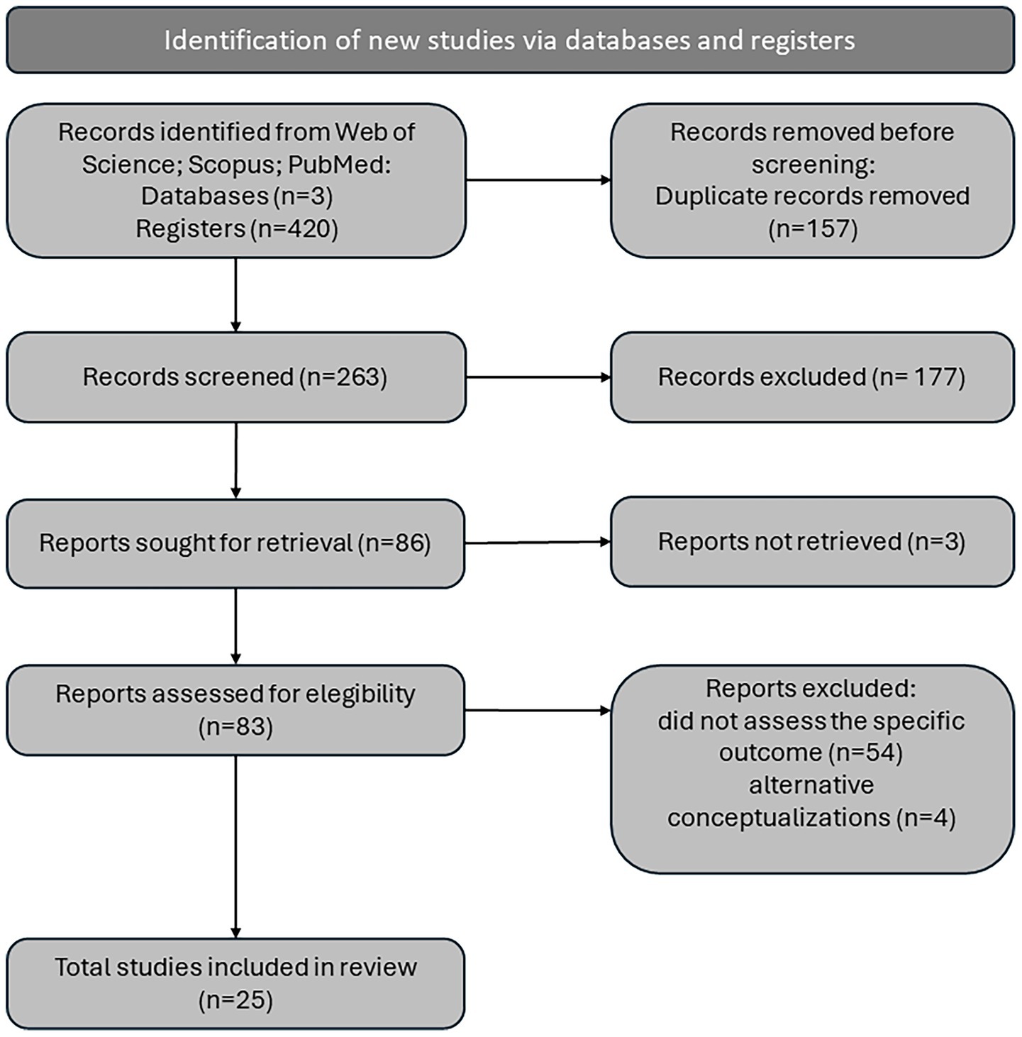 The final search was conducted on 14 January 2024. A total of 205 results were retrieved from the WoS database, 163 from Scopus, and 52 from PubMed. A total of 157 papers were identified as duplicates and subsequently excluded. The remaining 263 abstracts and methods were then reviewed to ascertain whether they met the inclusion criteria. A total of 177 papers were excluded from further analysis, as they did not meet the pre-established criteria. Among excluded reports, 88 were deemed irrelevant to the topic, primarily due to the non-behavioural application of the term ‘discounting’, 46 studies were found to have employed an invalid measure for anxiety, as defined by established criteria, 23 studies did not studied human subjects, 14 were excluded as they differed in design from those for which this review was conducted, four were not scientific articles, and two studies did not assess delay of gratification. The remaining 86 papers were then subjected to a further assessment to determine their eligibility. A further examination of the reports led to the exclusion of 54 papers on the grounds that they did not explicitly assess the relationship between delayed gratification and anxiety, and a further four on the basis that they addressed concepts that were incompatible with the objective of this review. Three articles were excluded from this review due to unavailability of the necessary resources. The remaining 25 articles were subjected to a process of data extraction, the results of which are presented in Table 1.