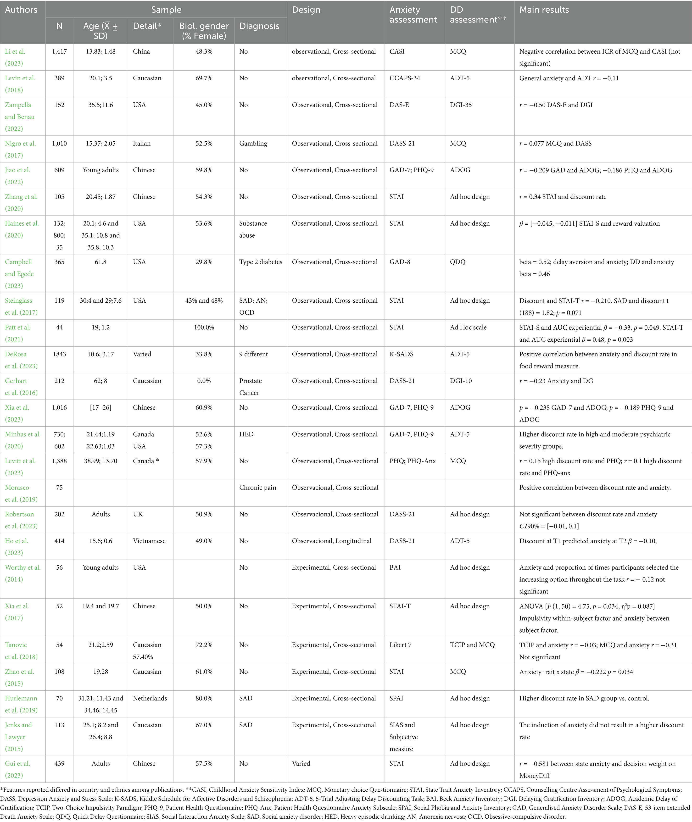 Of the studies reviewed, 16 provided evidence in favour of the existence of a positive association between anxiety and DD. This evidence suggests that higher levels of anxiety are related to higher discount rate, which means a lower ability of subjects to delay gratification. Significant associations supporting this hypothesis were identified in 12 of the papers (Campbell and Egede, 2023; Gerhart et al., 2016; Ho et al., 2023; Jiao et al., 2022; Levin et al., 2018; Levitt et al., 2023; Morasco et al., 2019; Nigro et al., 2017; Xia et al., 2017, 2023, p. 23; Zampella and Benau, 2022; Zhang et al., 2020), Two studies did not provide the corresponding statistical analysis (Hurlemann et al., 2019; Minhas et al., 2020) while two others reported non-significant associations (Tanovic et al., 2018; Worthy et al., 2014).