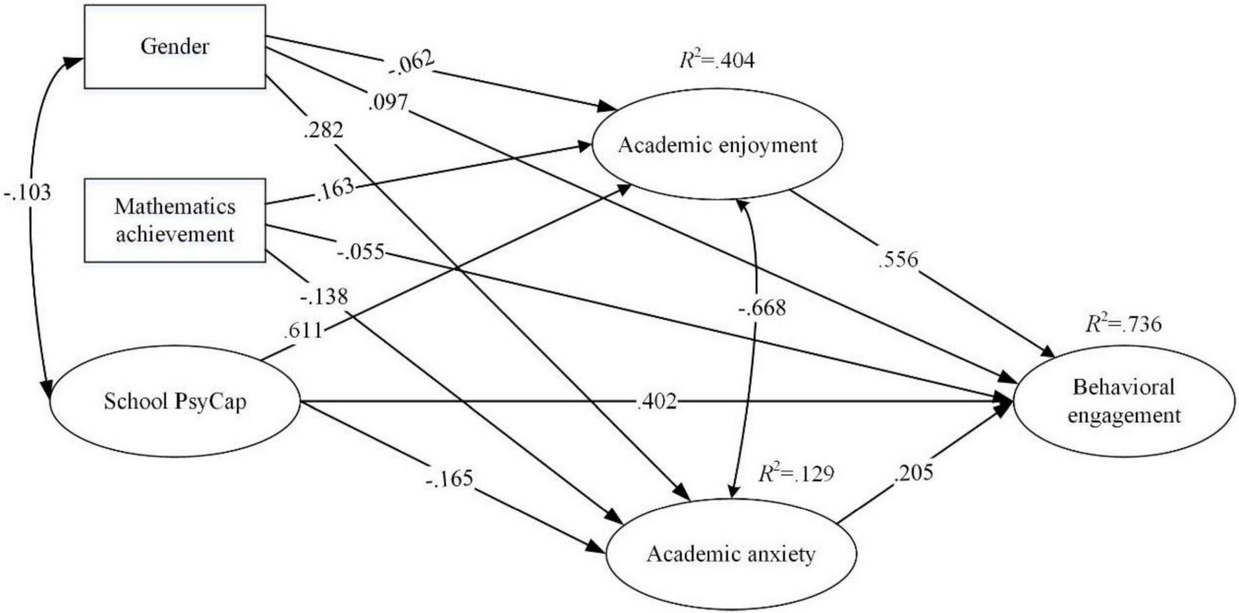 The relation between school PsyCap, academic enjoyment, academic anxiety and behavioral engagement. All the correlations and path coefficients shown in the figure are standardized and statistically significant (p < 0.05).