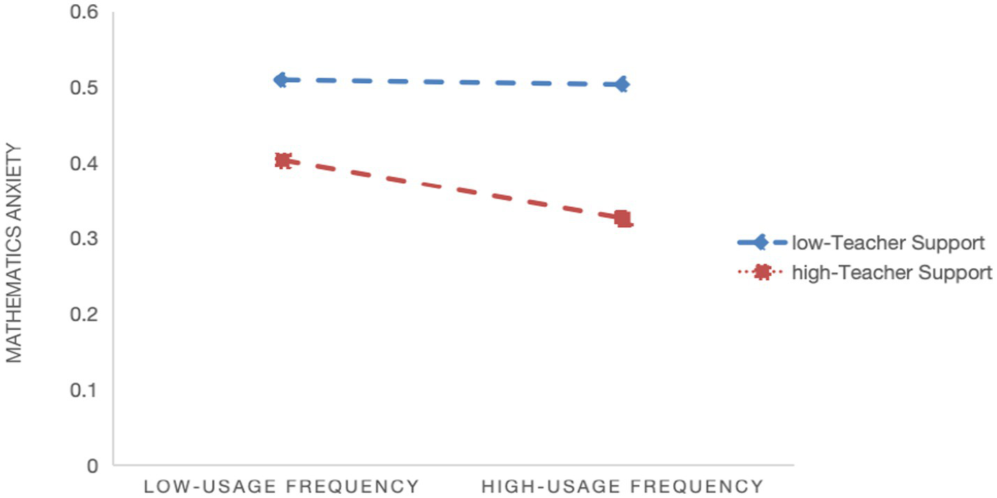 Hypothesis 2b: Teacher support moderates the relationship between usage frequency and students’ math learning anxiety.