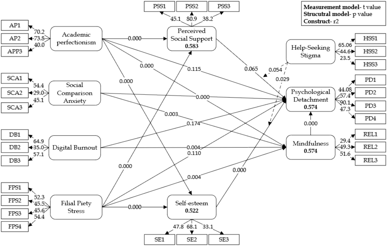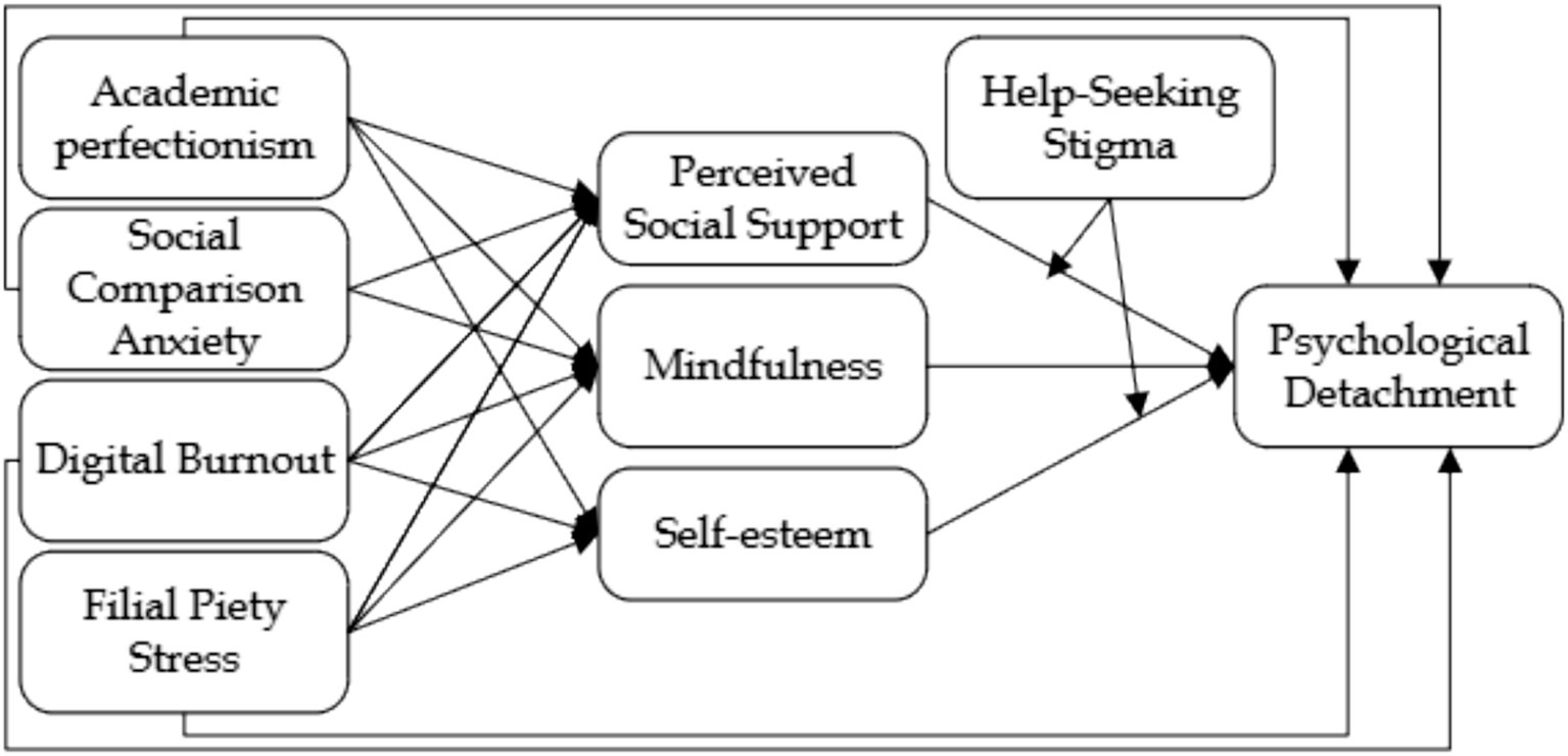 Although resilience, self-esteem, and perceived social support are widely recognized as psychological buffers (Hobfoll, 2010), their mediating roles in enabling detachment under simultaneous academic, technological, and familial pressures remain underexplored. In addition, help-seeking stigma—a well-documented sociocultural barrier in East Asia—moderates whether students access or activate these resources. While empirical studies have linked stigma to reduced service use (Hu et al., 2024), it has not yet been modeled as a barrier to detachment, nor tested as a moderator in resource-based coping frameworks (Wong et al., 2022; Park et al., 2025).