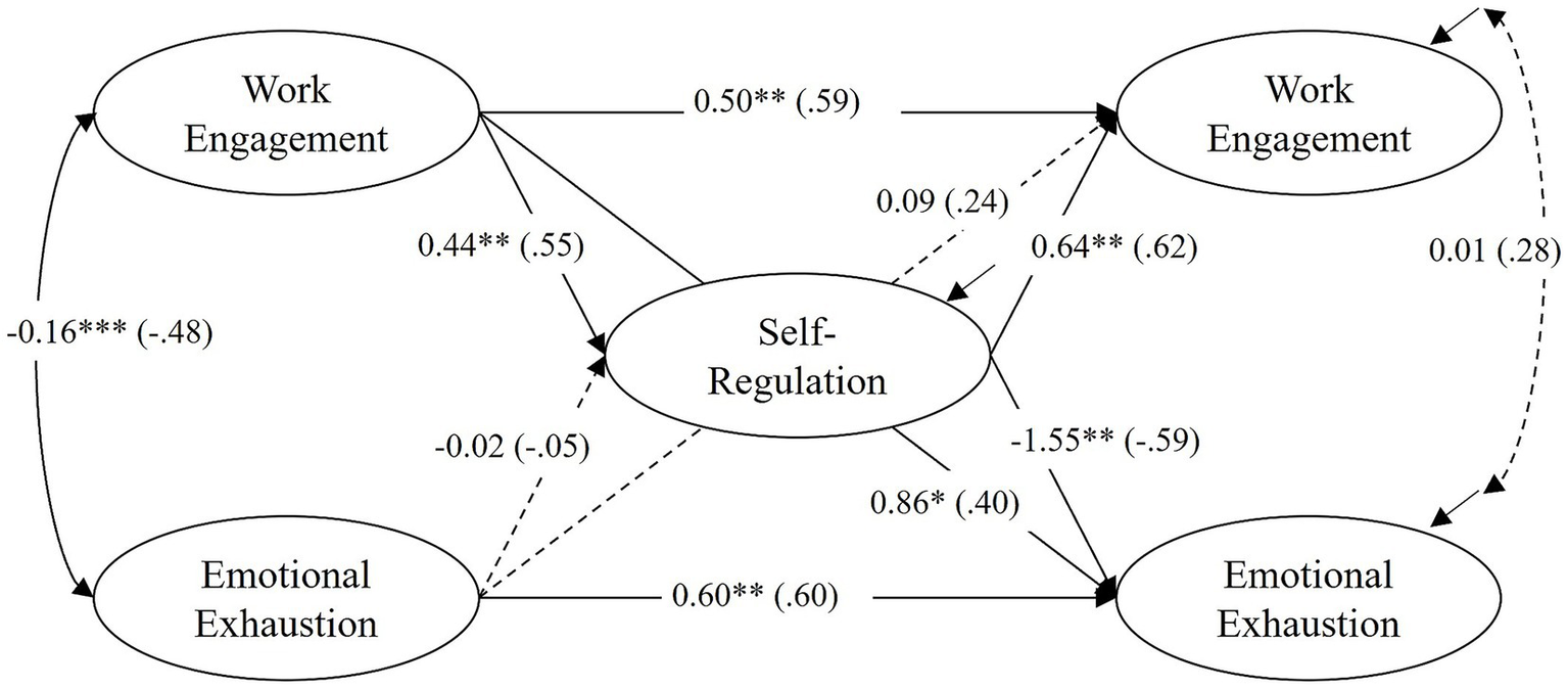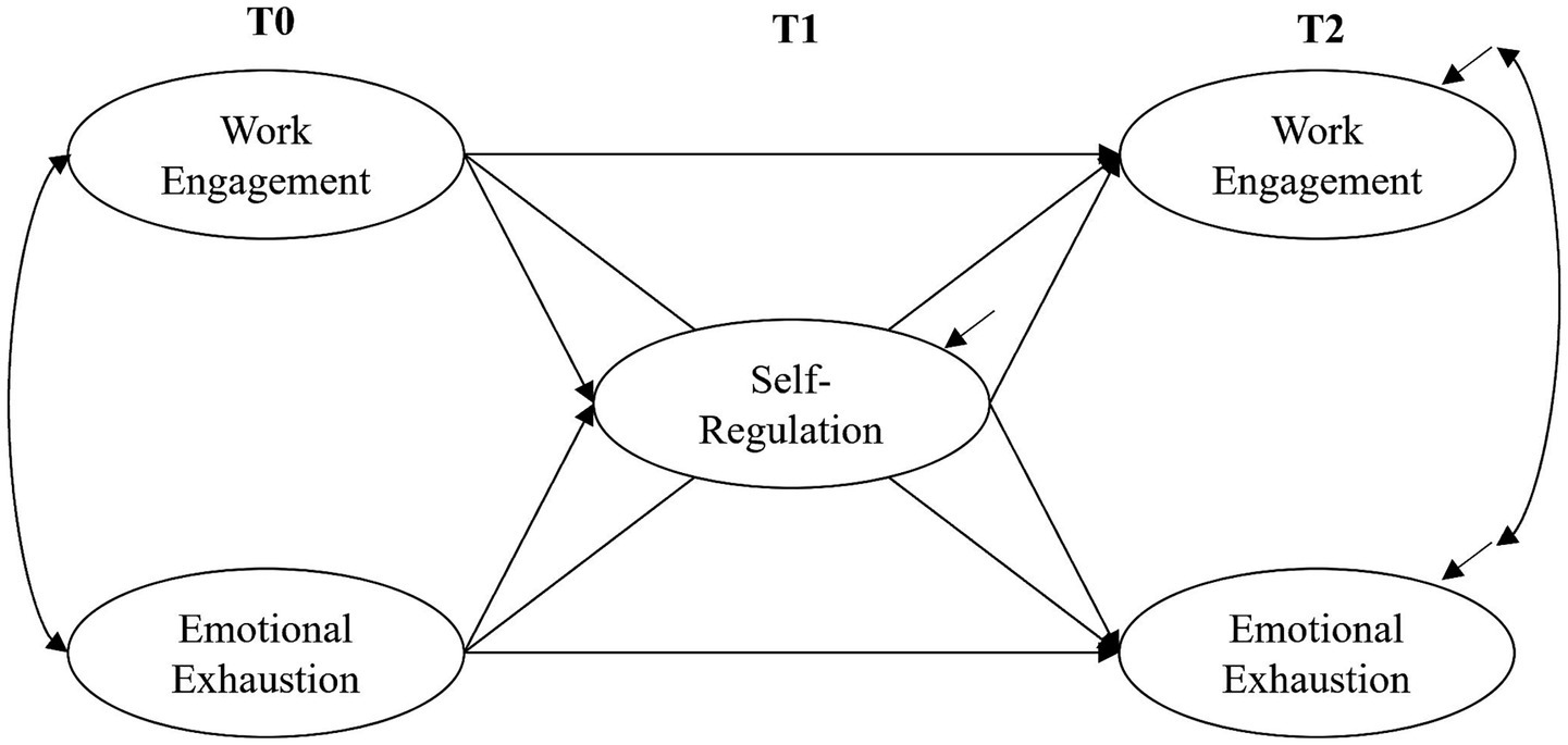 The meta-analysis of Mazzetti et al. (2023) highlights the significance of personal resources (resilience, self-efficacy, optimism, proactivity) for work engagement. As self-regulation is another important personal resource, and there are initial indications of corresponding effects on work engagement (De Stasio et al., 2019), we expected that teachers with higher self-regulation at T1 would tend to be more engaged in their work at T2. Furthermore, in line with the theoretical assumptions of the JD-R framework (Bakker and Demerouti, 2017), we also analyzed the reciprocal relationships between emotional exhaustion, work engagement, and self-regulation. The longitudinal design with three measurement points also allowed us to test indirect effects and thus whether self-regulation may play a mediating role. This is supported by theoretical assumptions (e.g., Cramer et al., 2018) that (personal) resources have this mediating function on emotional exhaustion and potentially also on work engagement.