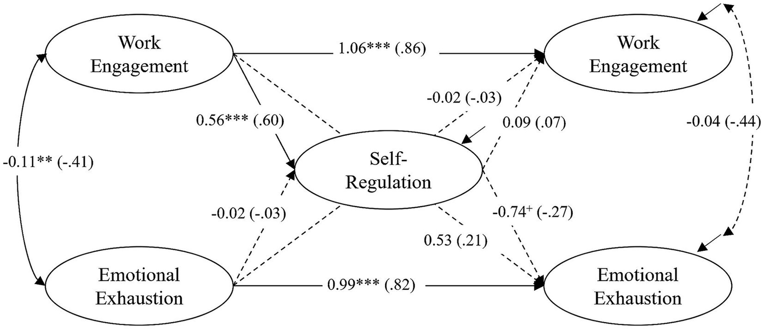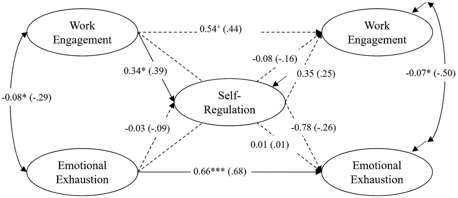 TG – training group (N = 95): results of the latent structural equation model of self-regulation, work engagement and emotional exhaustion. All coefficients are unstandardized (standardized coefficients in parentheses). Nonsignificant paths are shown as dashed lines. +p < 0.10, *p < 0.05; **p < 0.01; ***p < 0.001.
