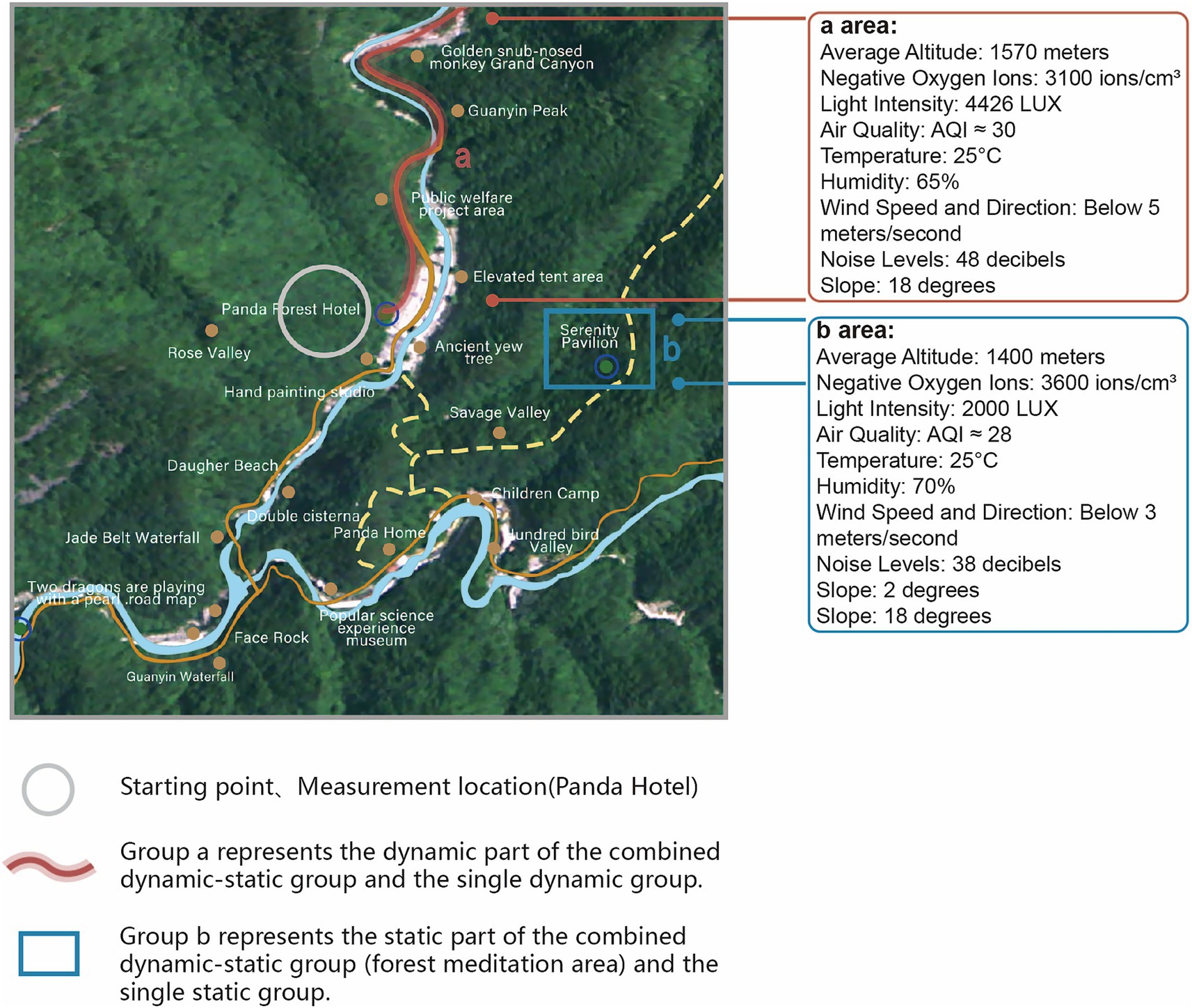 Group A used Route 1, combining a walk from Panda Forest Hotel to Golden Monkey Grand Canyon and static activities at Jingxin Pavilion. Jingxin Pavilion, near the hotel, served as the starting point for all routes. Group B used only the walking route of Route 1, and Group C used only Jingxin Pavilion.