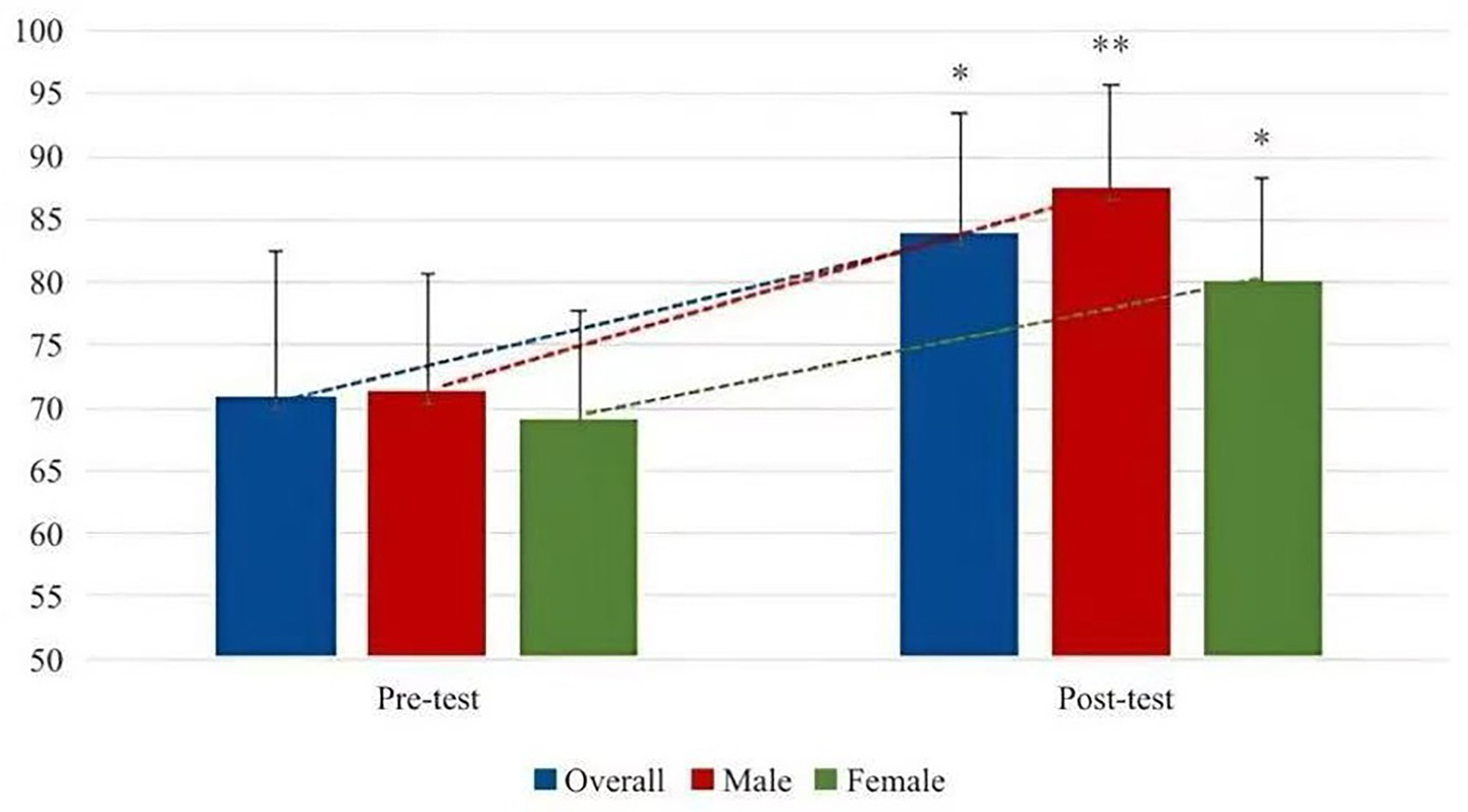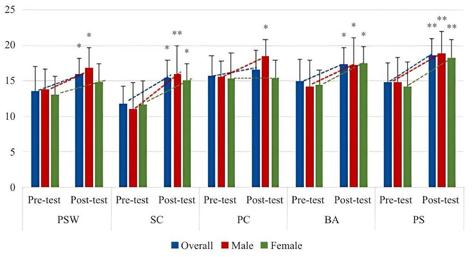 From Table 4, Latin dance teaching significantly improves students’ body self-esteem, and male participants are ahead of female participants. In the five small dimensions, except for the evaluation of physical condition, the other dimensions are significantly improved. In the longitudinal comparison of PC, male participants have improved significantly, while female participants have not significantly changed and have slightly decreased. In the other four dimensions, male participants’ physical self-esteem and SC have improved faster than female participants, and the difference in female participants’ physical self-esteem is not significant. In terms of BA and PS, the improvement of male participants and female participants is basically the same, and the improvement of PS is very obvious. The specific improvement trend is shown in Figures 2, 3.