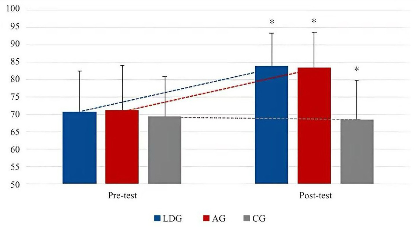 | PSPP | 83.95 ± 9.45 | 83.46 ± 10.27 | 69.46 ± 11.43 | 2.911 | <0.05* | LDG > AG AG > CG* LDG > CG* |