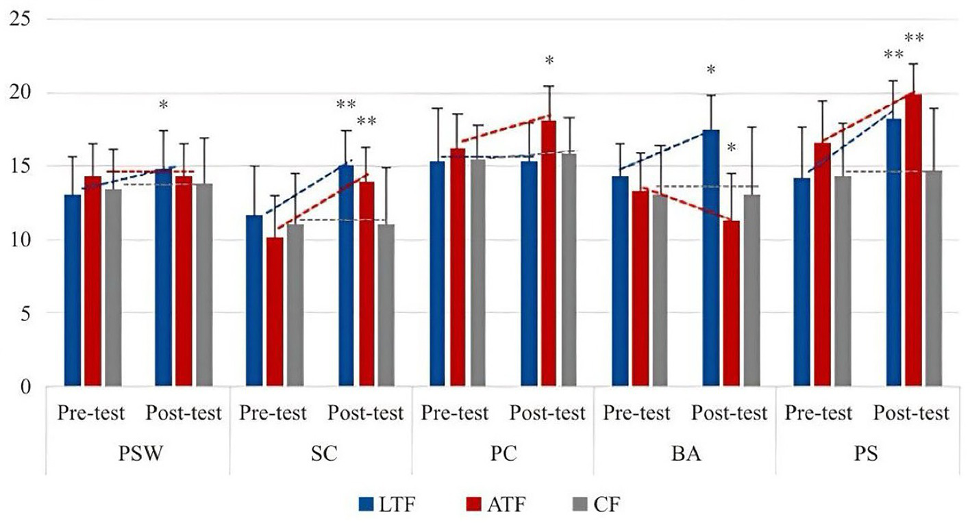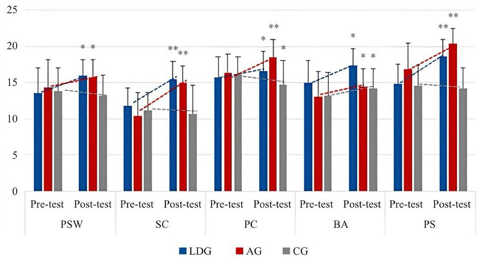 From Table 5, there was no significant difference between LDG and AG (original p > 0.05), but compared with CG, there was a significant difference (adjusted p < 0.05, corrected by Bonferroni). On each dimension, the difference in PSW was p > 0.05, with no significant difference, but the difference between the two groups and the control group was p < 0.05, and the difference was significant after Bonferroni correction, but the difference between the two groups and the control group is p < 0.05, which is significantly different from the control group; in the evaluation of PC, the difference p value between each two groups is less than 0.05, and the difference is significant. The order of evaluation level from high to low is AG, LDG, CG, in the evaluation of BA, the difference p value between each two groups is less than 0.05, and the difference is significant, and the order from high to low is LDG, AG, CG; in the evaluation of PS level, the difference between AG and CG is p < 0.01, and the difference is very significant. The p values of the other two groups are less than 0.05, and the difference is significant. The order of evaluation level from high to low is AG, LDG, CG. The changing trends of the total score and each dimension of body esteem in each group are shown in Figures 4, 5.